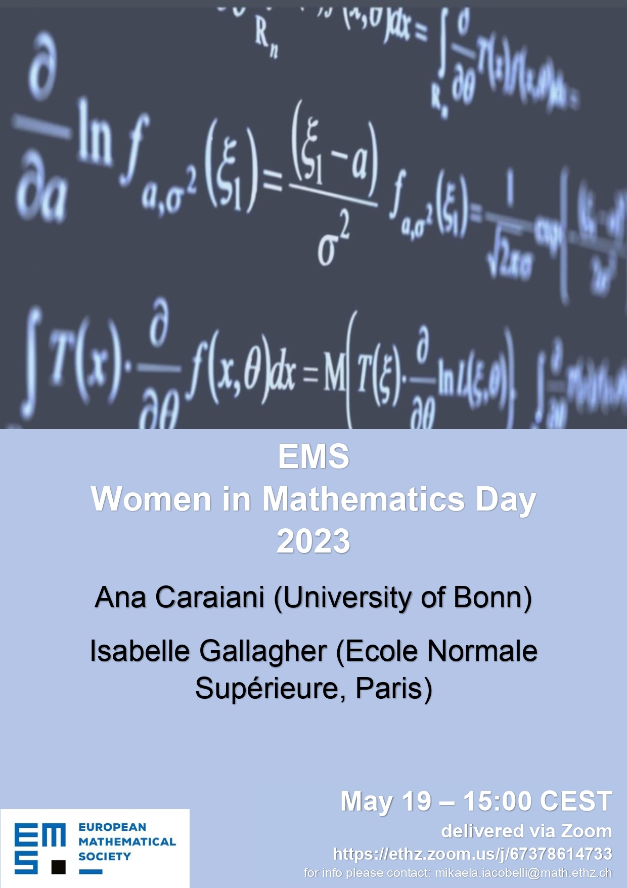 The Women in Math Committee (WiM) of the European Mathematical Society is organising an event called “EMS/WiM Day”; within the initiative of “May 12th”, a celebration of women in Mathematics in memory of Maryam Mirzakhani. The event consists of scientific talks (at the level of a Colloquium talk) of two distinguished speakers, which will take place online on Friday, May 19th, 2023, with the following schedule: