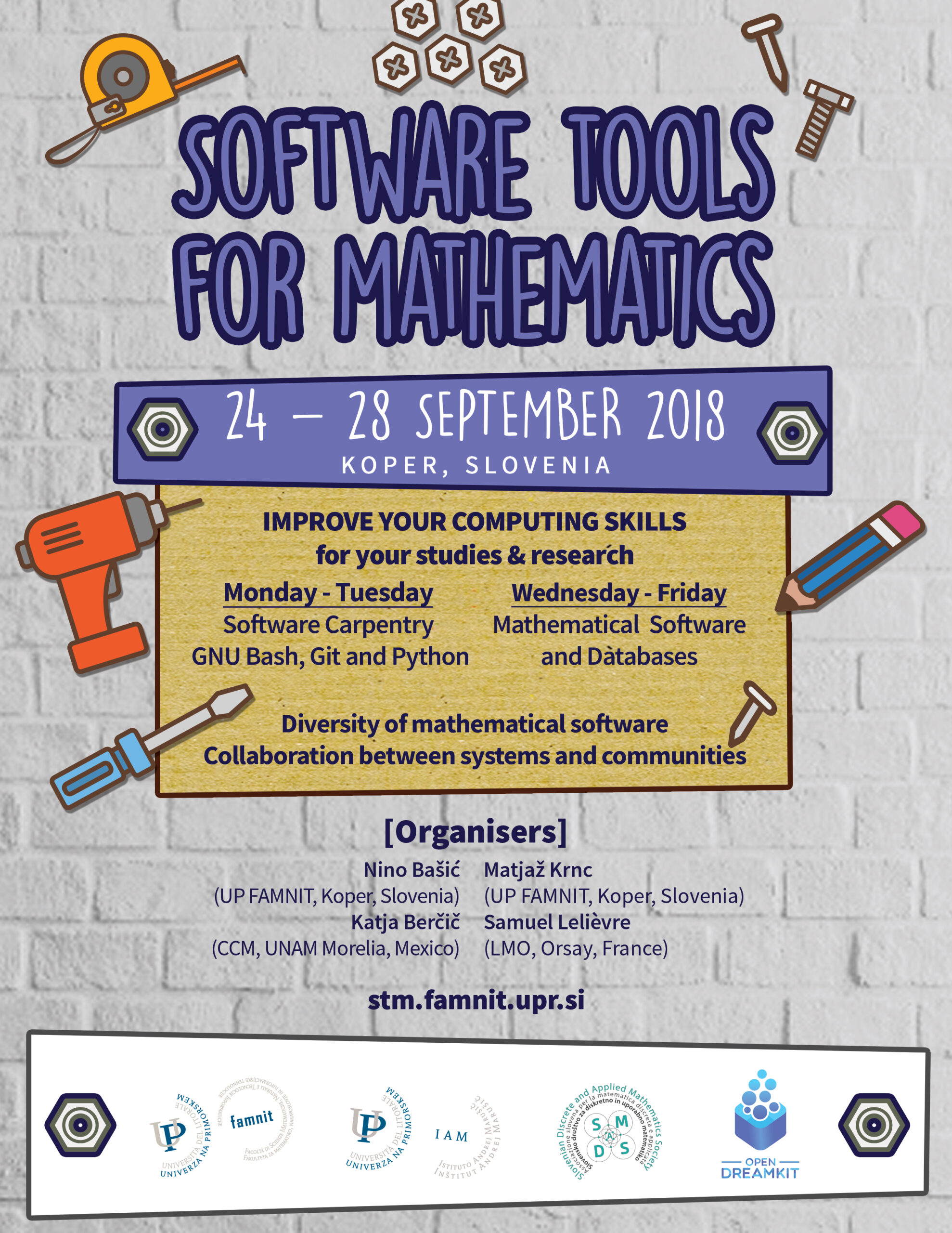 We are glad to invite you to participate to the workshop on Software Tools for Mathematics which will be held from 24 to 28 September 2018 in Koper, Slovenia.