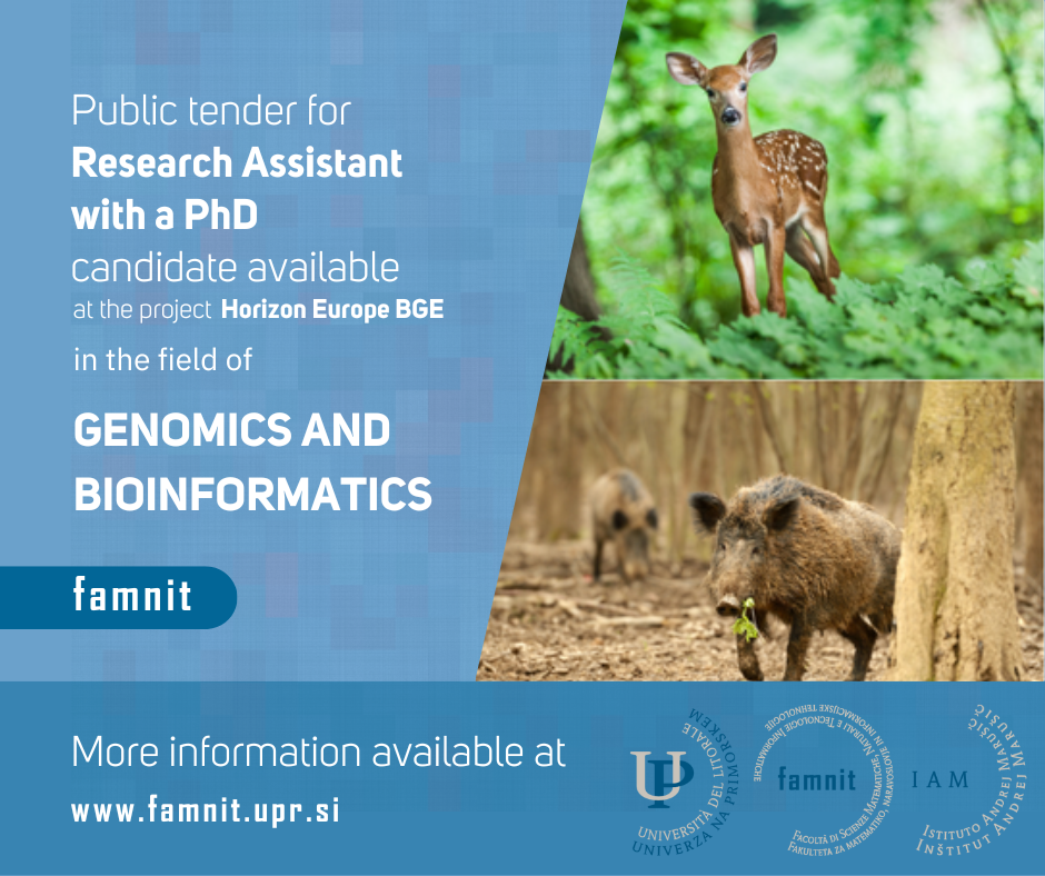 The University of Primorska is seeking a Research Assistant with a PhD and experience in genomics and bioinformatics, in the area of whole genome sequencing. This position is full-time (40 hours per week) for 2 years with possibilities for extension. The successful candidate will mostly be involved in the EU-funded project “Biodiversity Genomic Europe” and in a national project on wildlife genomics.