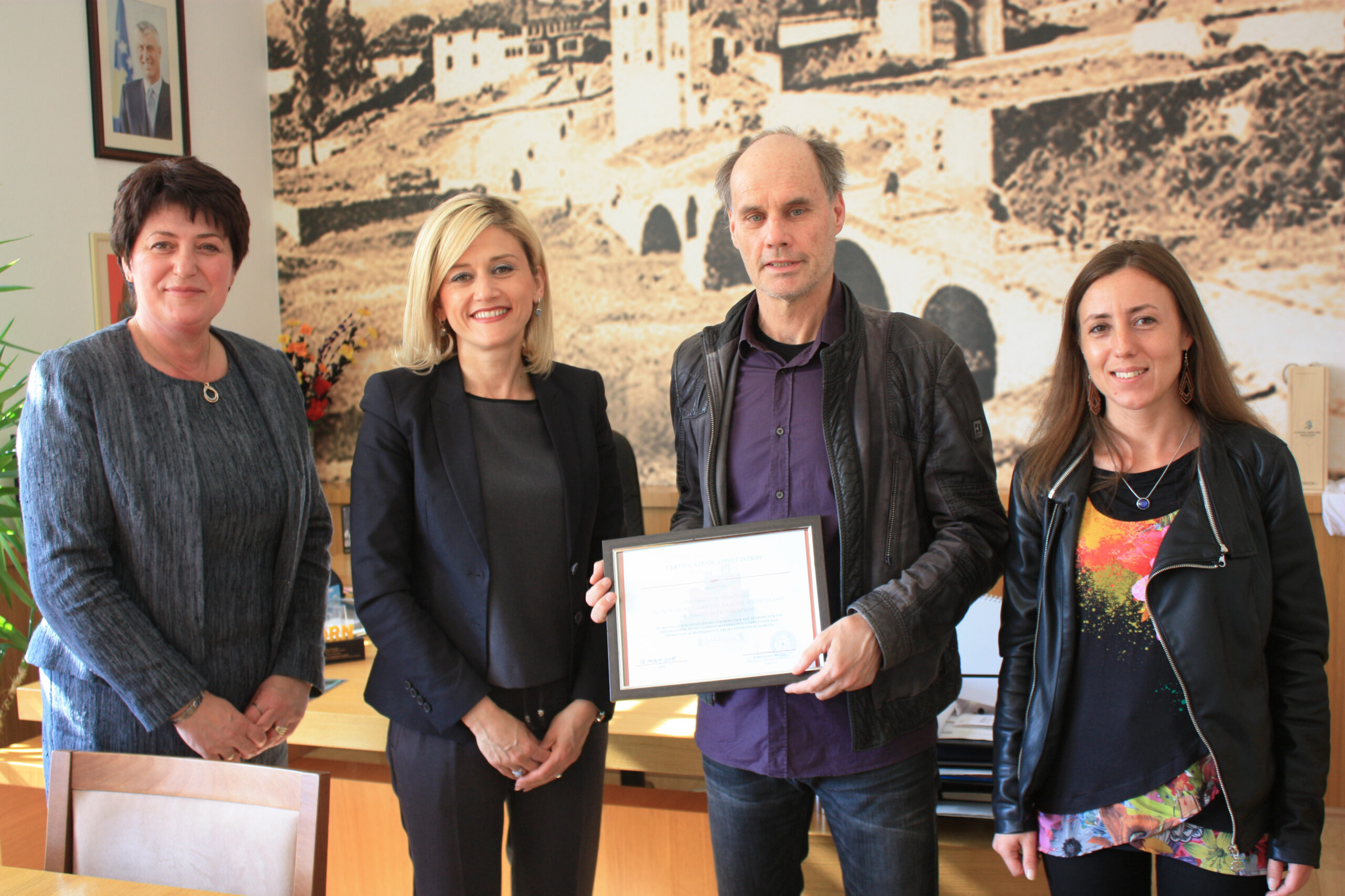 Before the awarding ceremony UP Rector Prof. Dragan Marušič and UP FAMNIT Dean Assoc. Prof. Klavdija Kutnar had a pleasant meeting with the Mayor of the Municipality of Gjakovë, Mimoza Kusari-Lila, and the Director of the Directorate of Education in the Municipality of Gjakovë, Diana Qarkaxhija, who from the beginning strongly supported the idea of organizing a mathematics competition, which came from UP FAMNIT 1st year Mathematics students Eda Kaja, Lisi Qarkaxhija and Arbër Avdullahu.