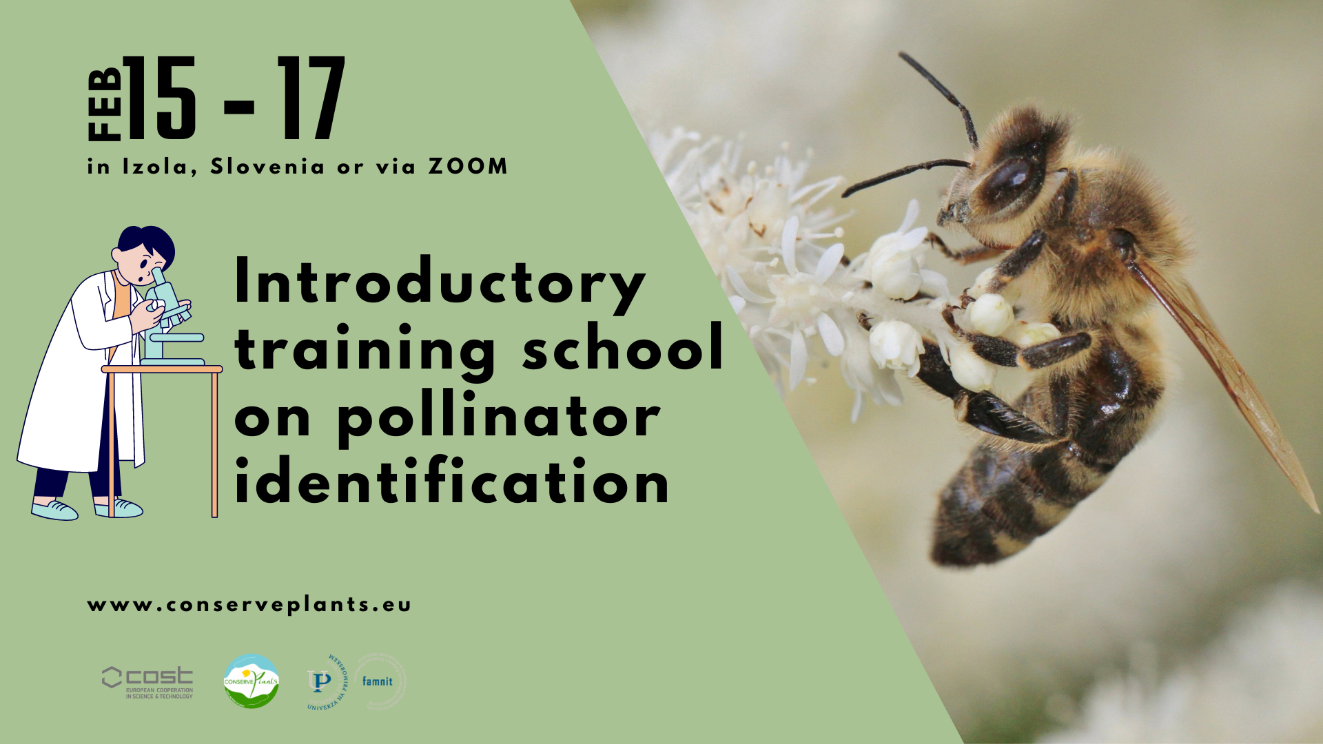 Within the ConservePlants COST Action (CA18201), the Department of biodiversity is organizing a Training school on pollinator identification in Izola from 15th to 17th of February. This Training school will teach the importance of pollinators, targeting groups like butterflies, hoverflies and bees, and their biology, ecology, monitoring methods, conservation, preparation of specimens, identification, etc. It will host 15 Early Career Researchers (including MSc and PhD students) and Conservation Practitioners from all over Europe, focused on pollinator taxonomy, biology, ecology and identification.