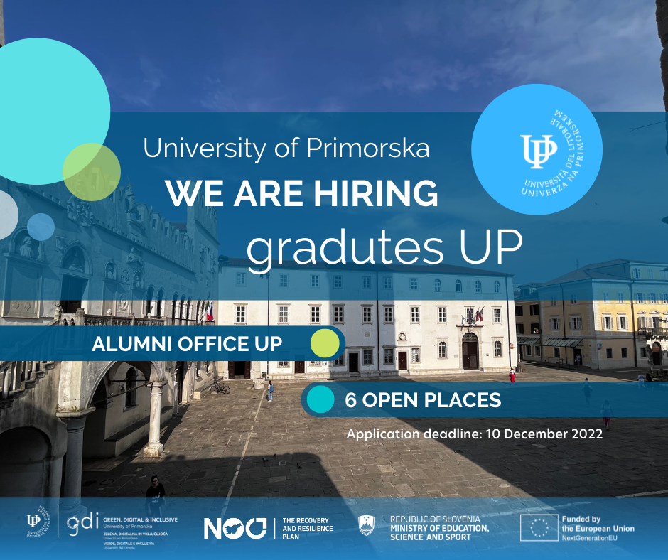 We are looking for very varied profiles, graduates of the University of Primorska who will develop new forms of activities for our Alumni and beyond. Since our university is embedded in an international environment, positions are also open to candidates from other countries. The working language will be English.