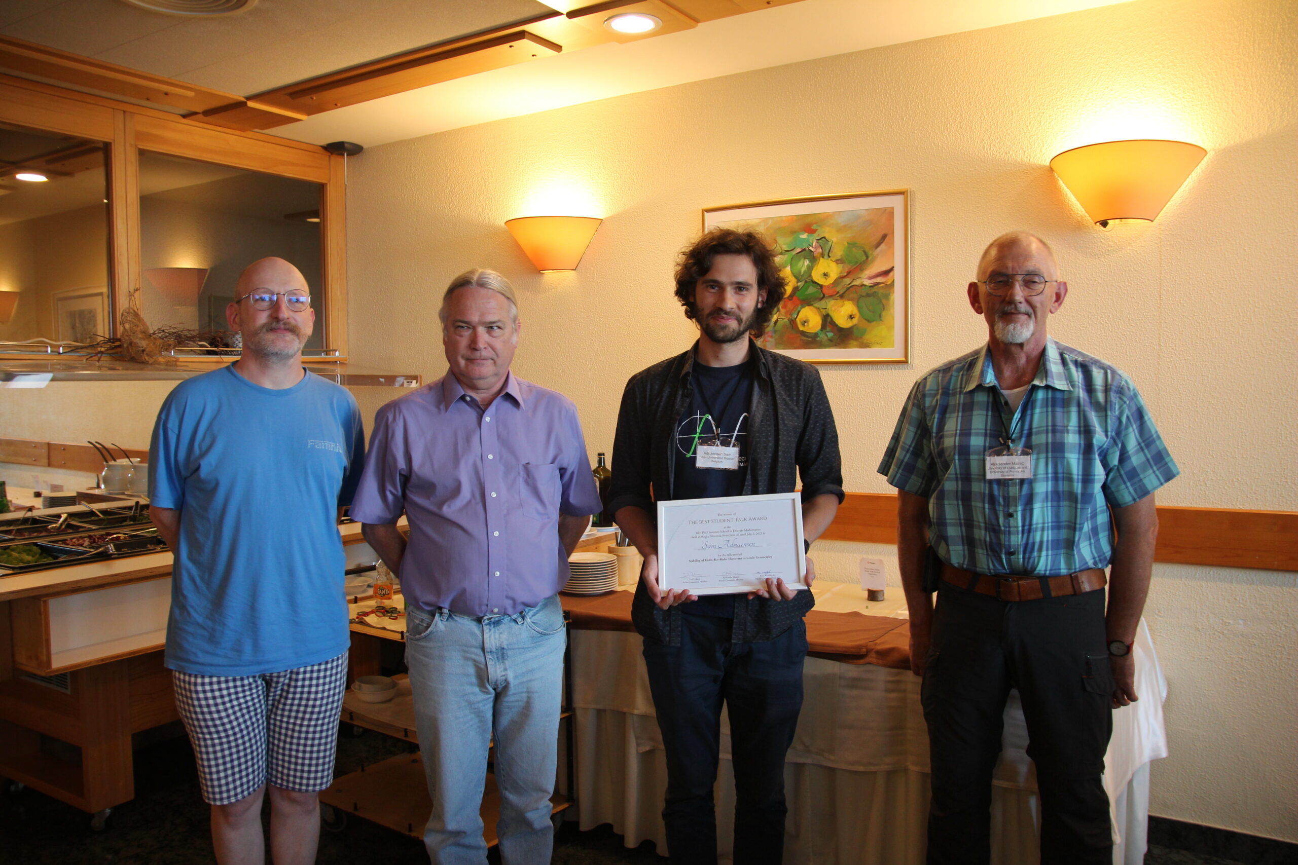Študenti so se tudi letos potegovali za nagrado za najboljšo predstavitev. Odbor, ki so ga sestavljali Ted Dobson, Aleksander Malnič in Russ Woodroofe, je odločil, da je zmagovalec Sam Adriaensen (Vrije Universiteit Brussel), ki je za nagrado za najboljšo študentsko predstavitev z naslovom »Stability of Erdos-Ko-Rado Theorems in Circle Geometries« prejel prosto udeležbo na 11. doktorski poletni šoli iz diskretne matematike.