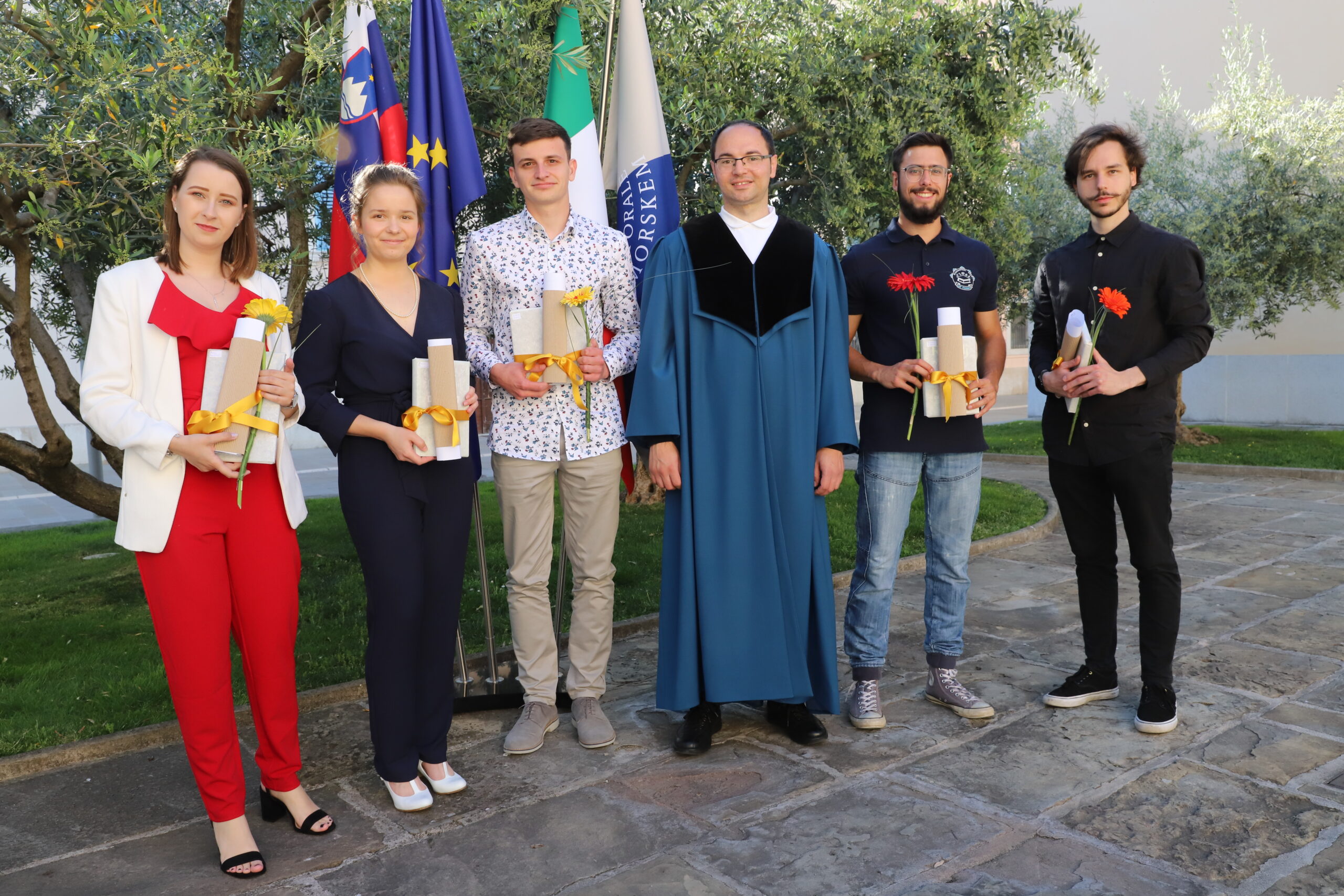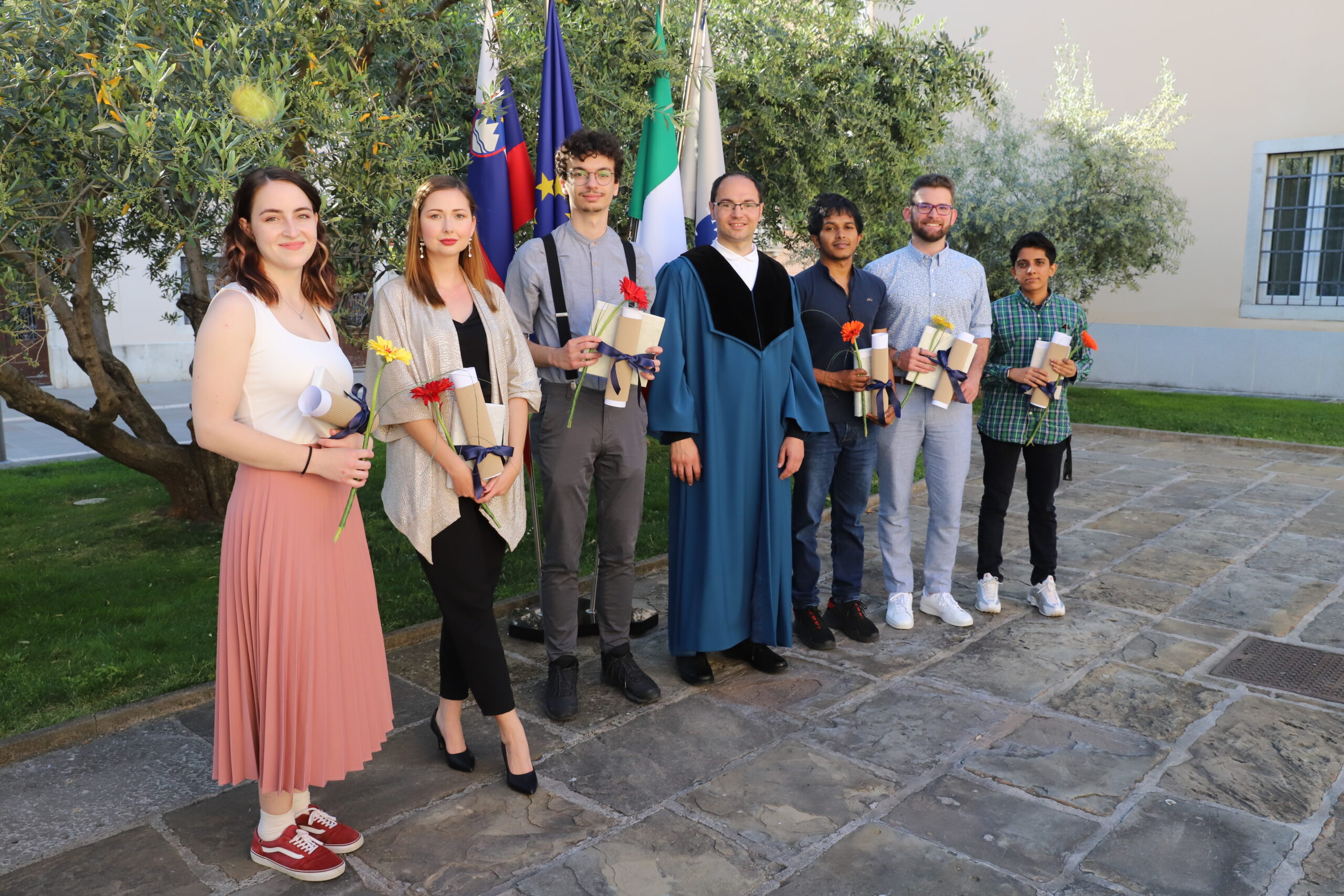 V petek, 28. maja 2021, smo na UP FAMNIT dobili novo generacijo diplomantk in diplomantov. Zaradi veljavnih ukrepov za preprečevanje širjenja bolezni SARS-CoV-2 (COVID-19) je dogodek potekal delno na daljavo in delno v živo. Uradni del podelitve, ki so ga letos vodili člani Študentskega sveta UP FAMNIT, je potekal v obliki prenosa preko konferenčnega sistema ZOOM iz avle fakultete, diplomanti pa so lahko dogajanju sledili v predavalnicah oziroma doma. Sledilo je uradno fotografiranje na prostem.