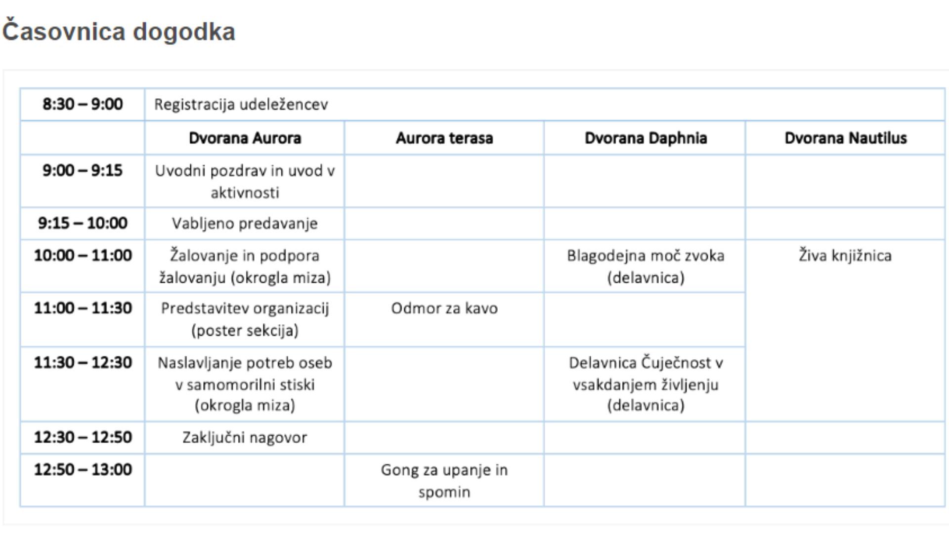 - okroglo mizo Žalovanje po samomoru in podpora žalovanju, z govorci: Anjo Klančar in Nežo Vilhelm, z izkušnjama samomora bližnjih, Ivanom Platovnjakom (duhovnim spremljevalcem žalujočih) in Tamaro Zemlič Radović (vodjo programa Žalovanje odraslih, otrok in mladostnikov pri Slovesnem društvu Hospic)