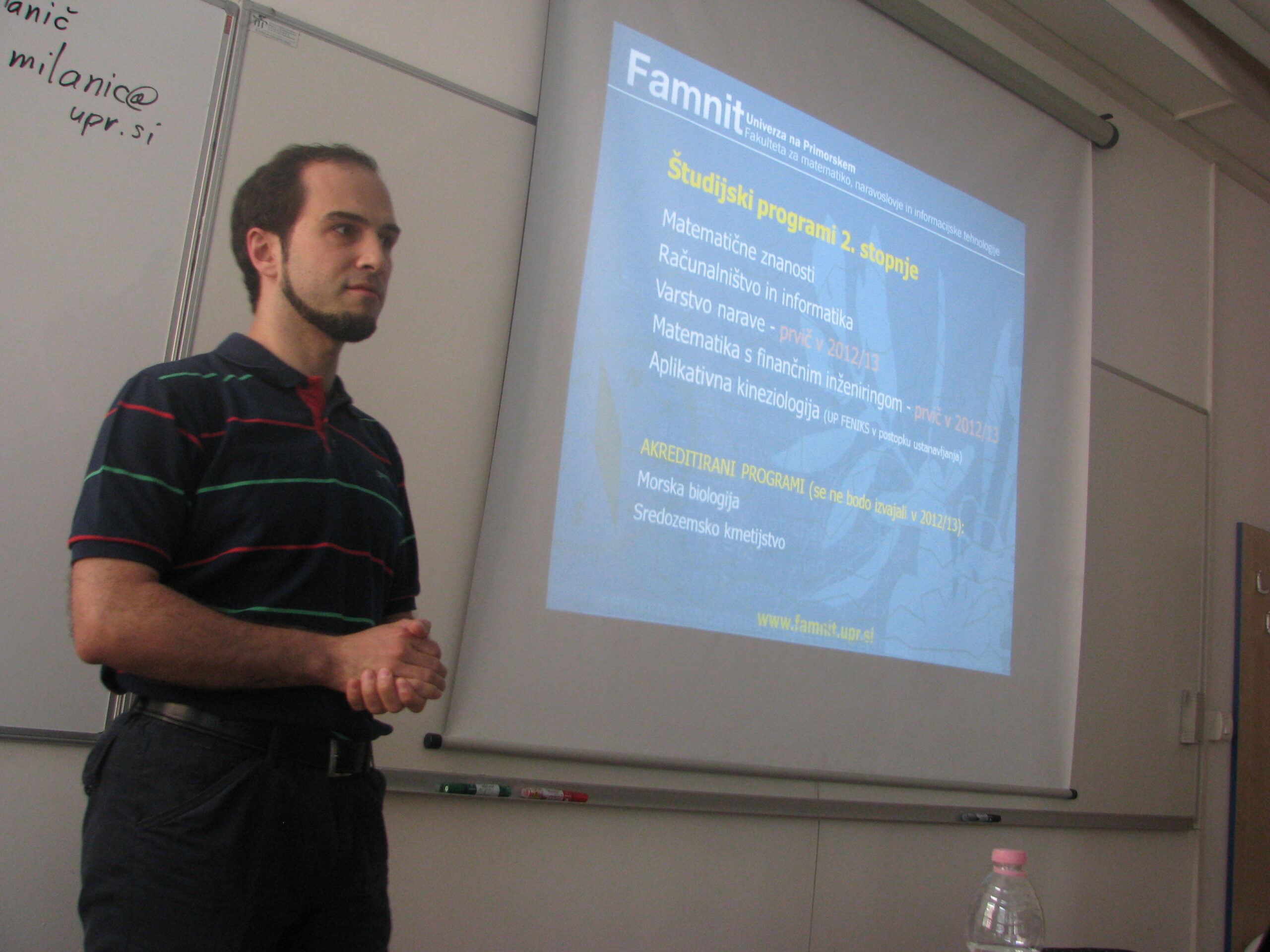 Kandidate za vpis je na sedežu fakultete pozdravil prodekan za študijske zadeve doc. dr. Martin Milanič. V drugem delu predstavitve so se prisotni podrobneje seznanili s posameznimi študijskimi programi. Programe so predstavili koordinatorji študijskih programov v sodelovanju z učitelji in asistenti posameznih oddelkov fakultete.