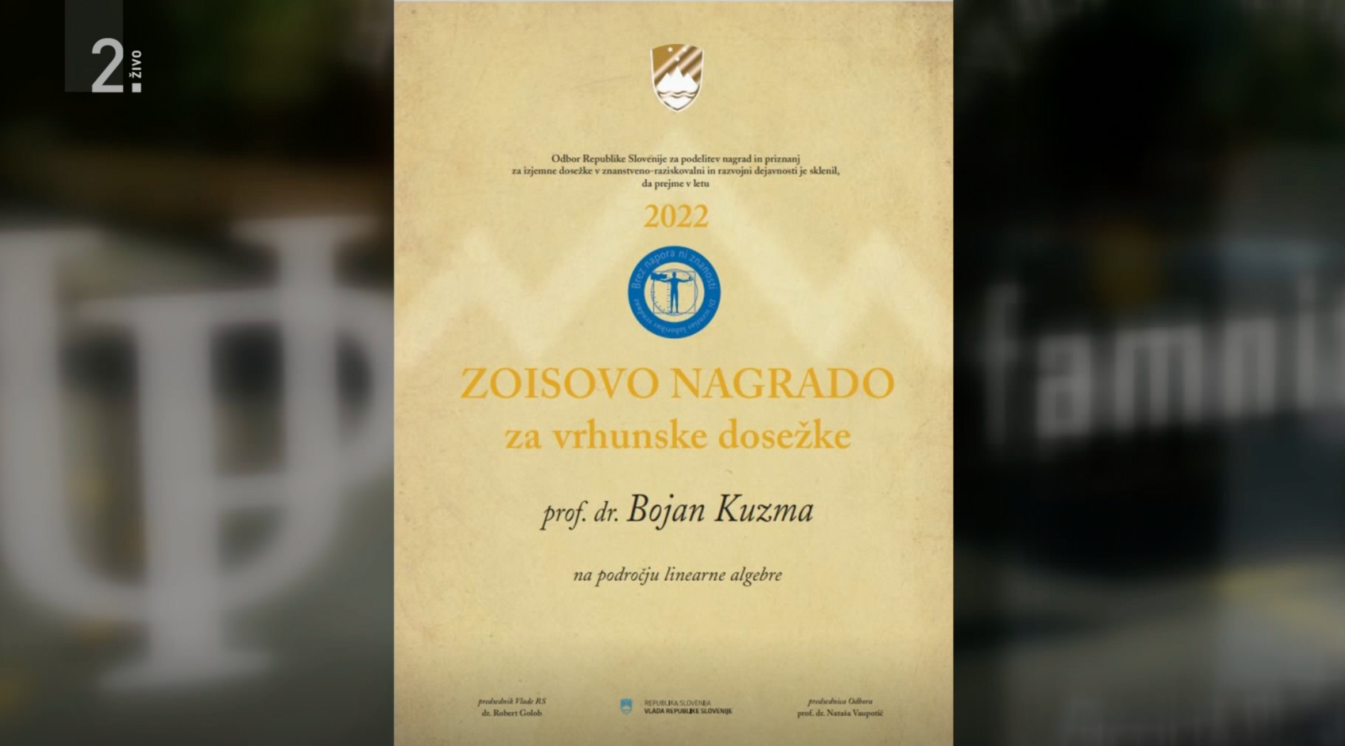 V ponedeljek, 19. decembra 2022, so bile podeljene letošnje Zoisove nagrade in priznanja, najvišje državne nagrade za dosežke na področju znanstvenoraziskovalnega dela in razvojne dejavnosti v RS ter Puhove nagrade in priznanja, najvišje državne nagrade na področju izumov, tehnoloških in netehnoloških razvojnih dosežkov in uporabo znanstvenih izsledkov z vseh znanstvenih področij pri uvajanju novosti v gospodarsko in družbeno prakso. Prejmejo jih raziskovalci in inovatorji, ki so s svojimi dosežki trajno prispevali k razvoju znanstvenoraziskovalne, razvojne in inovacijske dejavnosti v Republiki Sloveniji. Med letošnjimi prejemniki je dr. Bojan Kuzma, redni profesor in znanstveni svetnik na UP, ki je nagrado prejel za vrhunske dosežke na področju linearne algebre.