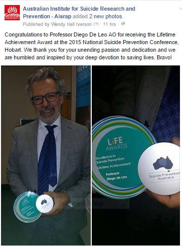 The Vice Chancellor’s 2014 Research Excellence Award je za leto 2014 v kategoriji »Individual Mid-career or Senior Researcher who has demonstrated an outstanding record of achievement in research« prejel prof. dr. Diego de Leo, ki vodi Australian Institute for Suicide Research and Prevention (delujoč v okviru omenjene univerze), pa tudi predstojniku našega Slovenskega centra za raziskovanje samomora.