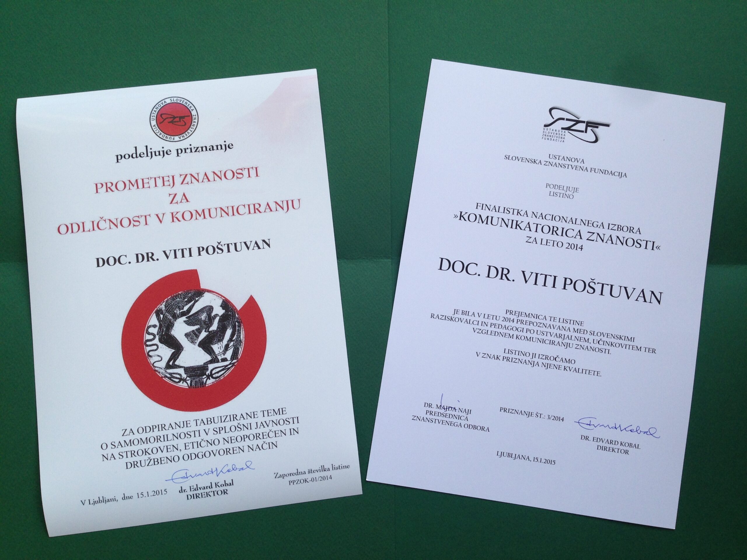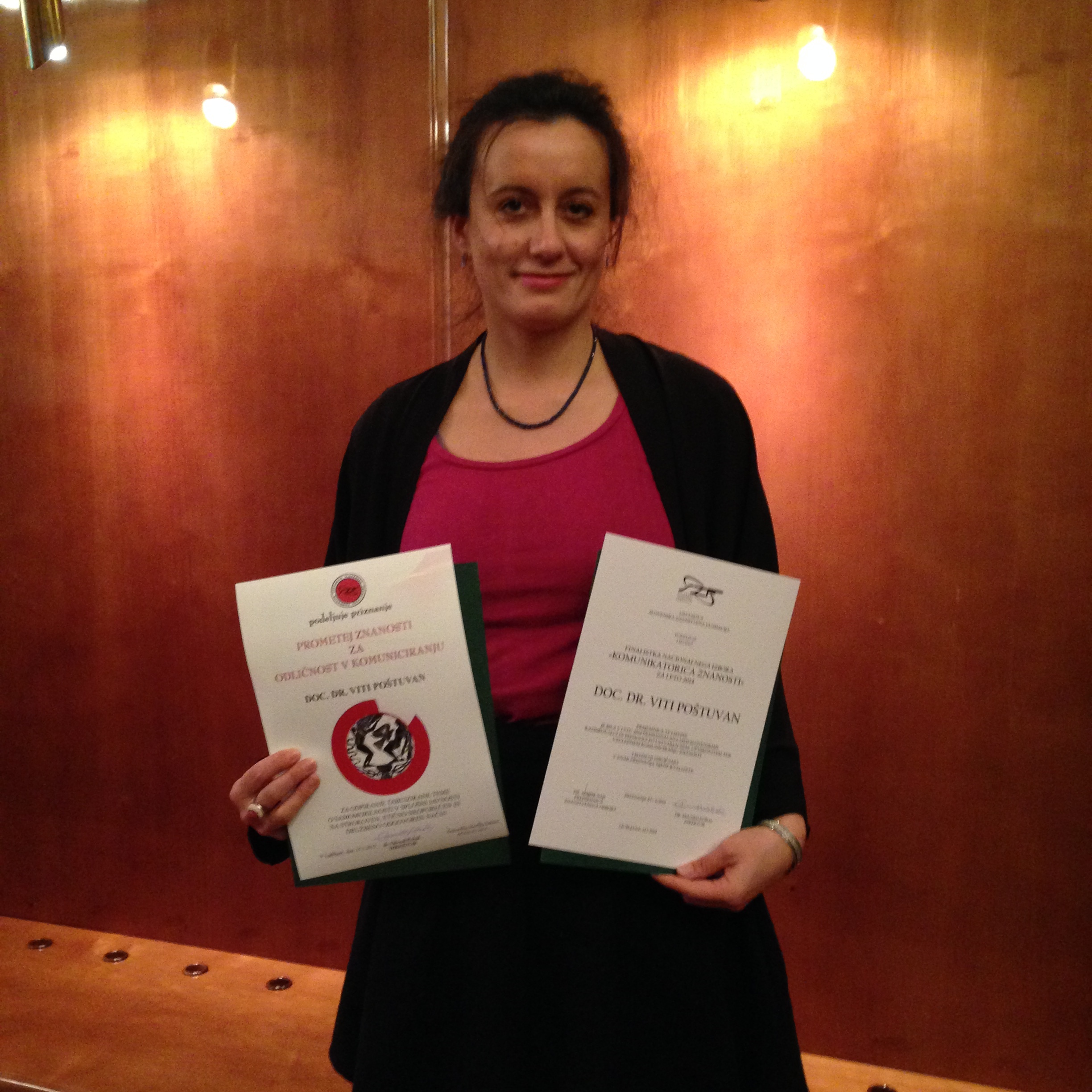 Naša sodelavka dr. Vita Poštuvan je včeraj v Prešernovi dvorani SAZU prejela nagrado Ustanove Slovenske znanstvene fundacije ‘Prometej znanosti za odličnost v komuniciranju’ za poslovno leto 2014.