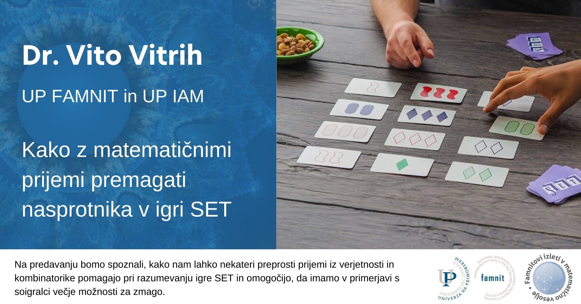 O predavanju: Igra SET je igra s posebnim kompletom 81 kart. Vsaka izmed kart je določena s štirimi lastnostmi, to so število, barva, oblika in polnilo simbolov na njej. Cilj je poiskati tako imenovane SET-e, to je nabore treh kart, ki so si po vsaki izmed štirih lastnosti med seboj vse enake ali pa vse povsem različne. Igra poteka tako, da imamo na mizi razporejene različne karte, igralci pa skušajo najti ustrezne kombinacije treh kart, ki izpolnjujejo opisan kriterij. Če uspejo najti pravilen set, ga poberejo z mize, na mesto odstranjenih kart pa se položijo nove. Na predavanju bomo spoznali, kako nam lahko nekateri preprosti prijemi iz verjetnosti in kombinatorike pomagajo pri razumevanju te igre in omogočijo, da imamo v primerjavi s soigralci večje možnosti za zmago. Igra je lahko zabavna tako za otroke kot tudi za odrasle.