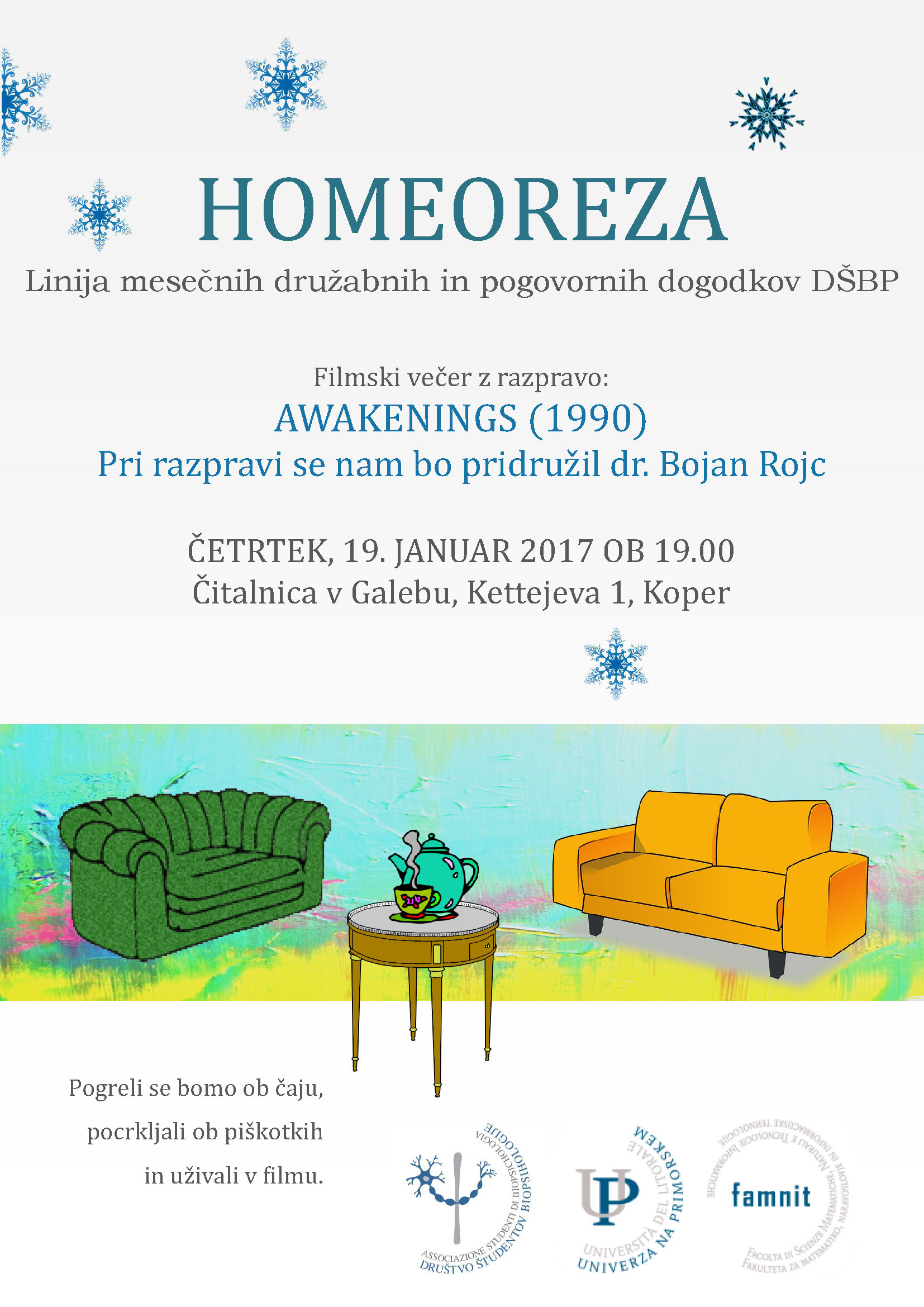 Društvo študentov Biopsihologije vabi na naslednji homeorestični dogodek, ki bo v četrtek, 19. januarja, ob 19.00, v študijski sobi v Galebu (Kettejeva 1) v Kopru.