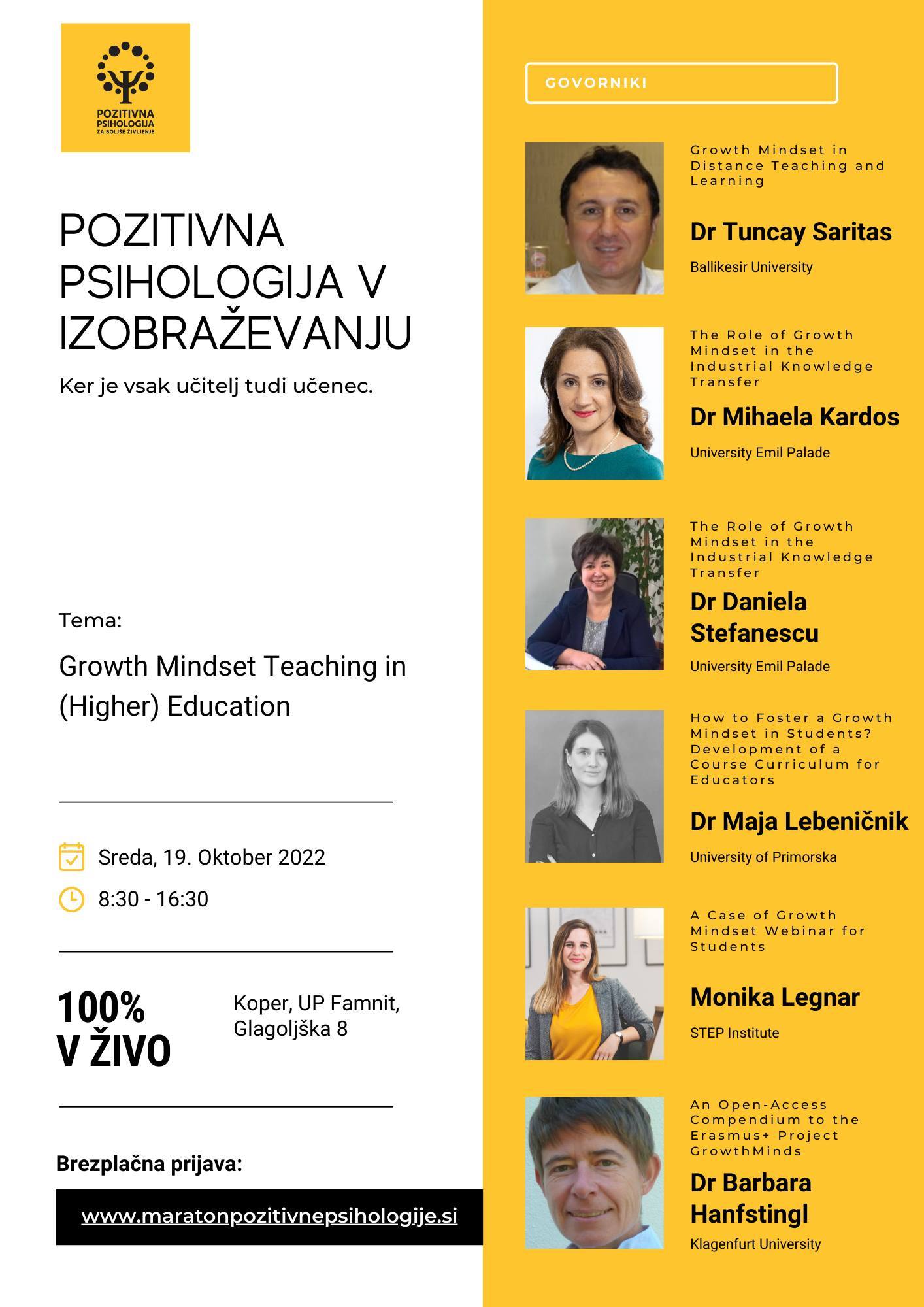 V sredo, 19. oktobra 2022, bo od 9.00 do 16.30 v Avli Fakultete za matematiko, naravoslovje in informacijske tehnologije (UP FAMNIT) potekal zaključni dogodek Erasmus+ projekta GrowthMinds – mednarodna konferenca »Growth Mindset Teaching in (Higher) Education«.