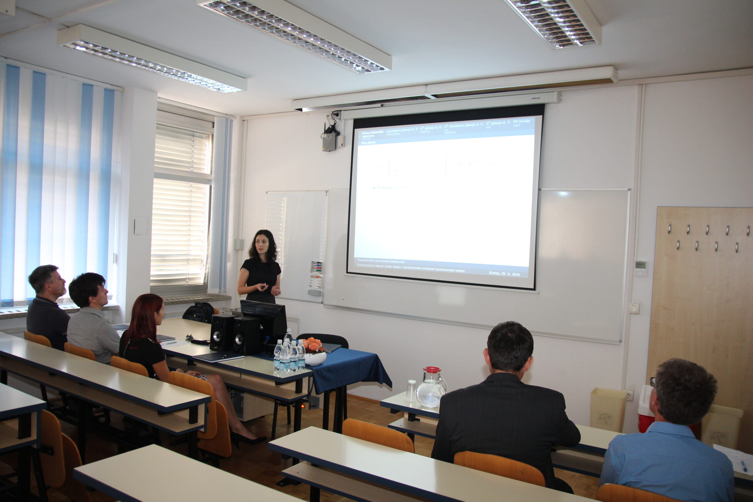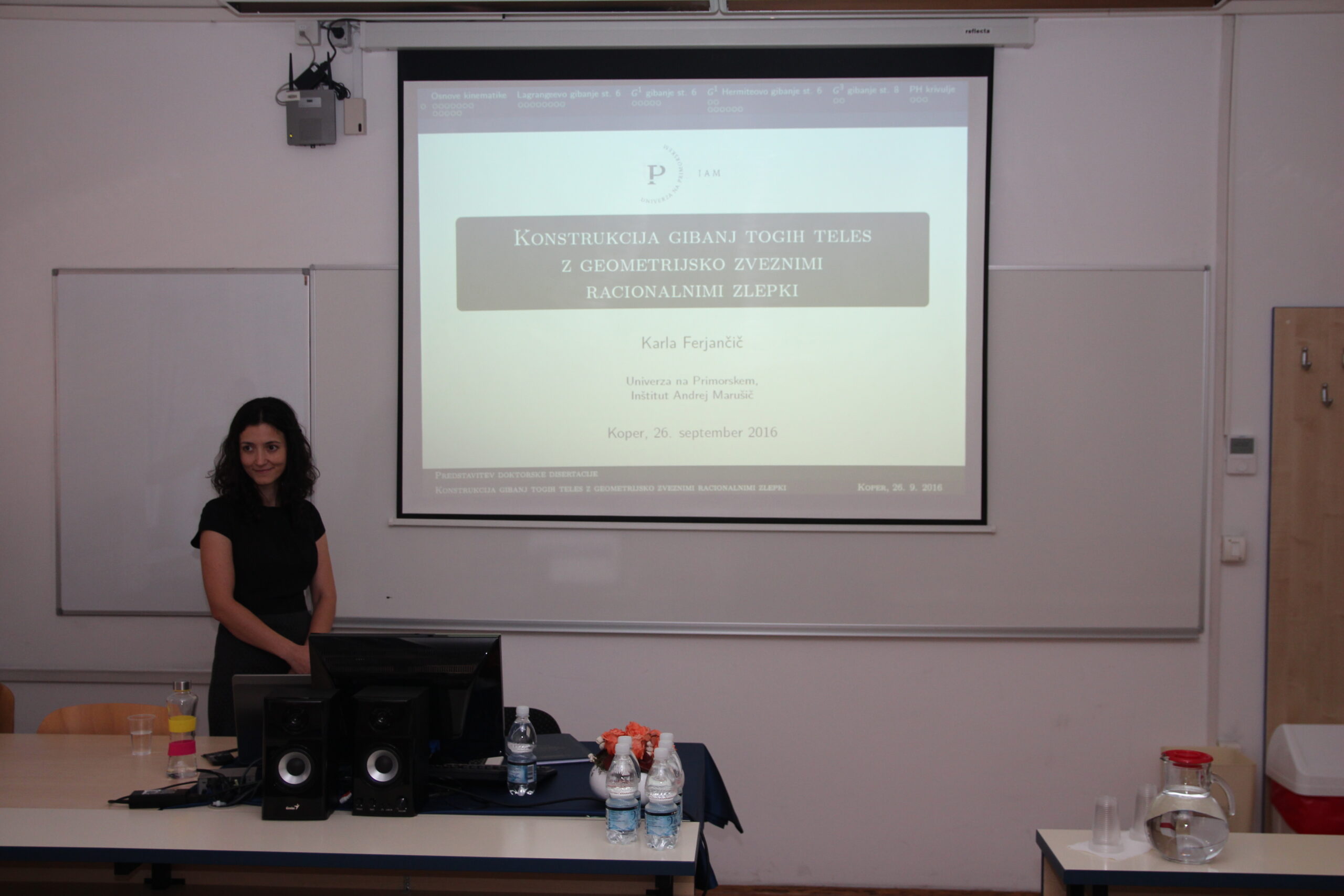 V ponedeljek, 26.9.2016 je Karla Ferjančič zaključila doktorski študij Matematičnih znanosti. Pod mentorstvom izr. prof. dr. Vita Vitriha in somentorstvom izr. prof. dr. Marjetke Krajnc je pripravila in uspešno zagovarjala doktorsko disertacijo z naslovom Konstrukcija gibanj togih teles z geometrijsko zveznimi racionalnimi zlepki.