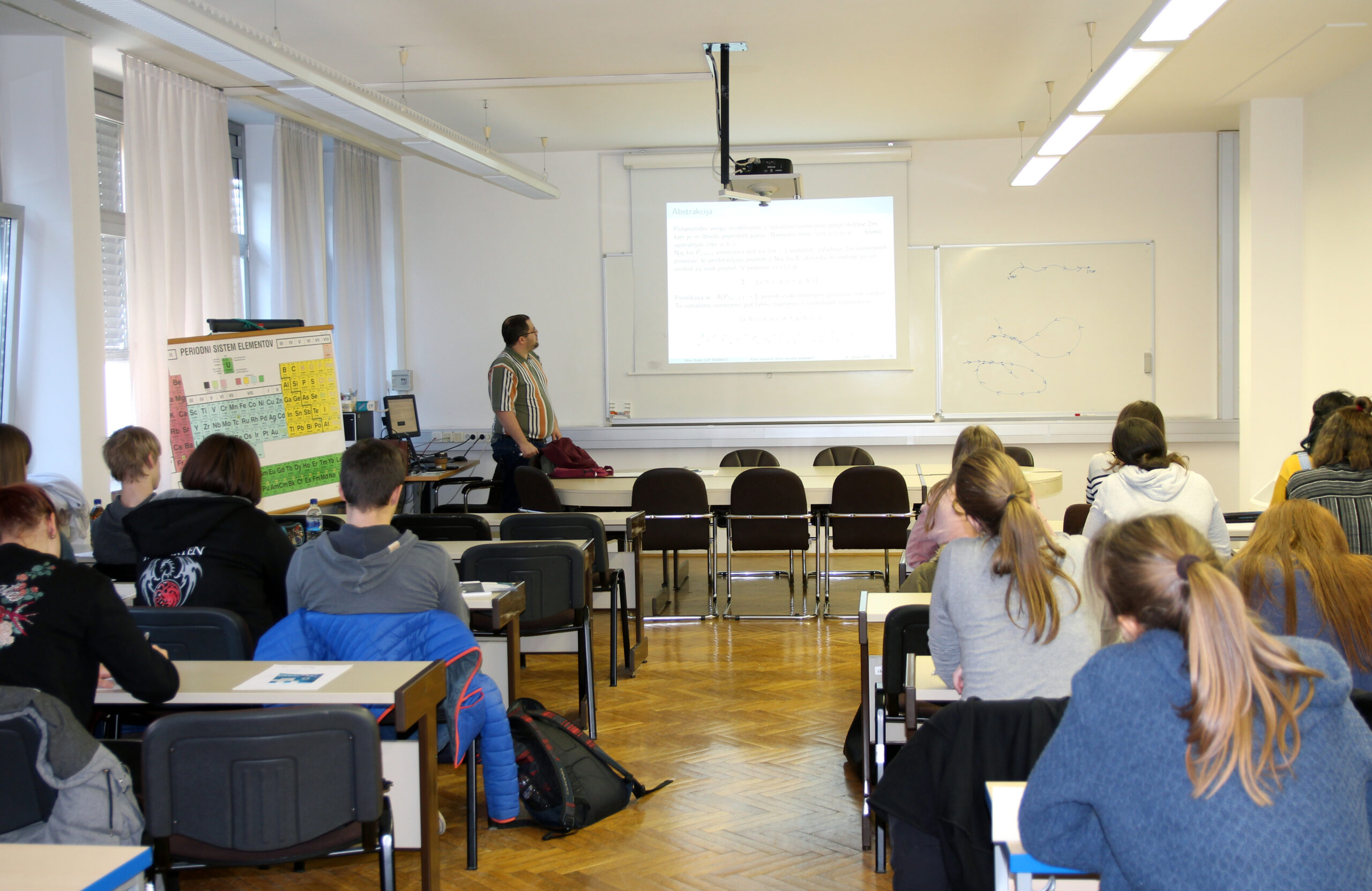 V sredo, 24. januarja, je na UP FAMNIT potekal 10. matematični dan, na katerega smo povabili dijake 3. letnika Gimnazije Koper. Na dogodek se je prijavilo 111 dijakov, ki so se v spremstvu profesoric za nekaj ur prepustili nekoliko drugačnemu, nešolskemu obravnavanju nekaterih tem v matematičnem ključu. Rdeča nit dneva je bila namreč ponazoritev različnih uporab matematičnih teorij v vsakdanjem življenju, za kar v srednješolskih kurikulih žal pogosto zmanjka časa.