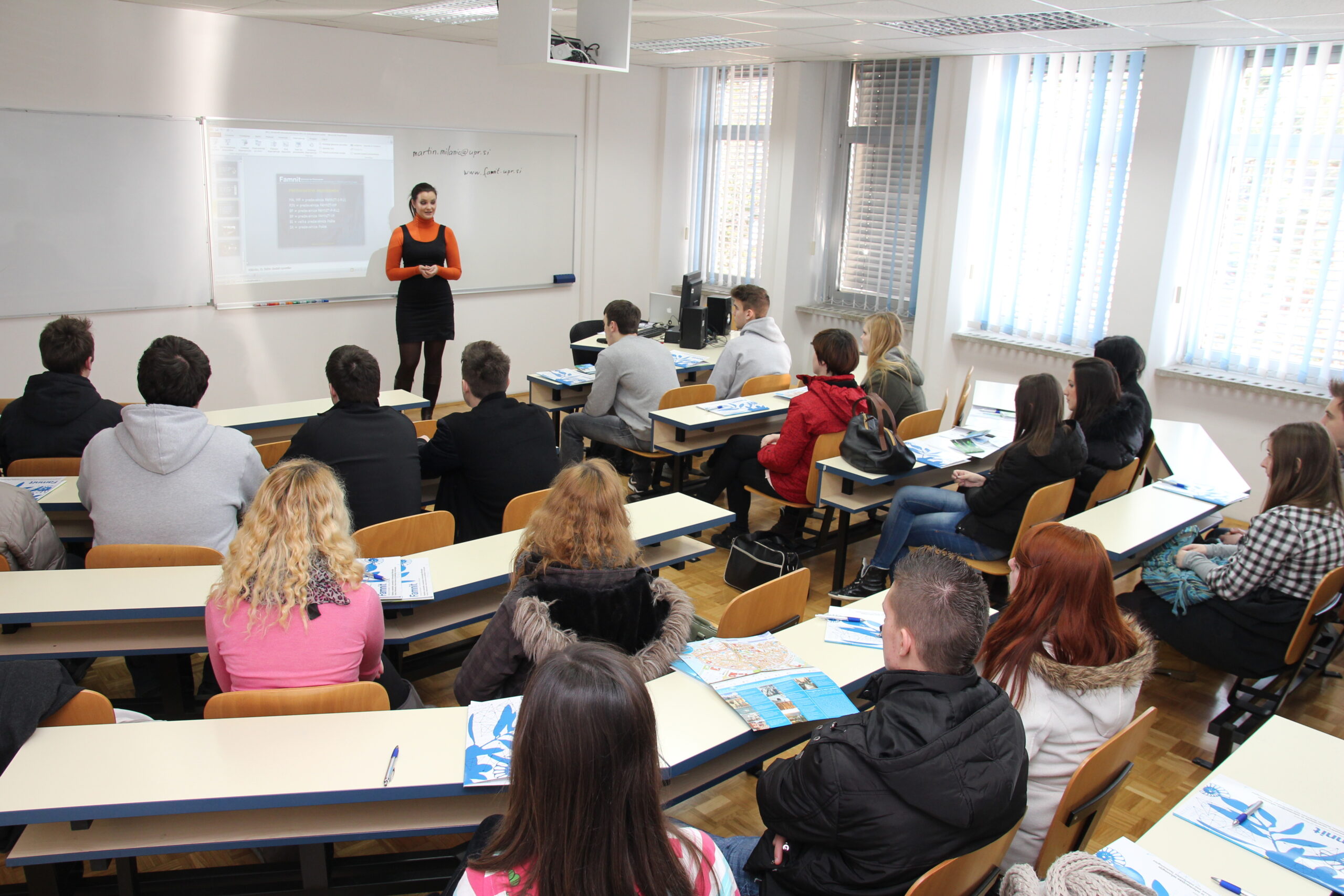 Kandidate za vpis so na sedežu fakultete pozdravili dekanja doc. dr. Klavdija Kutnar, prodekan za študijske zadeve doc. dr. Martin Milanič, predstavnika Študentskega sveta UP FAMNIT Olga Kaliada in Mitja Črne ter predstavniki Študentske organizacije Univerze na Primorskem.