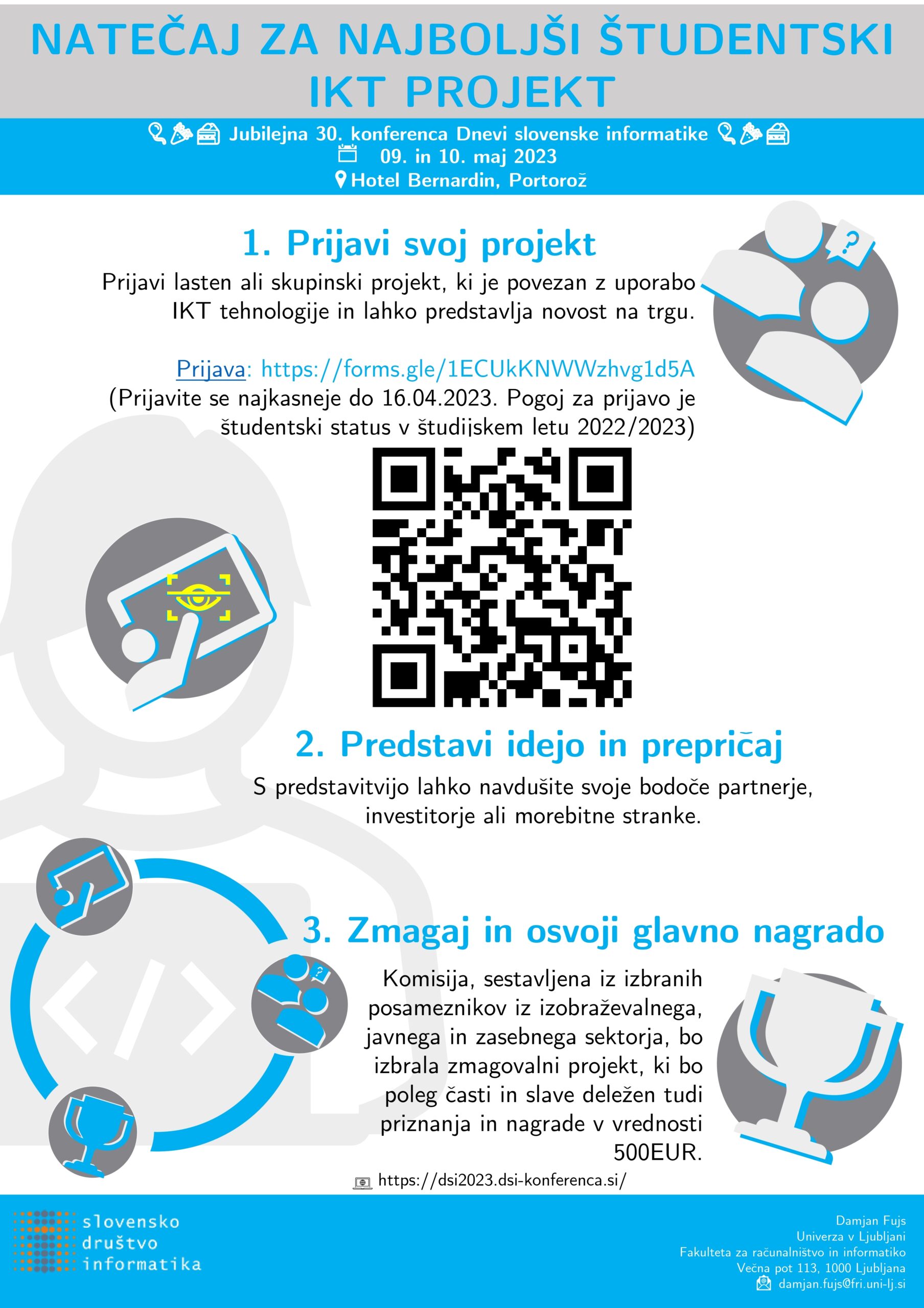 Vabljeni, da se kot študenti brezplačno udeležite jubilejne tridesete konference Dnevi slovenske informatike 2023 in prijavite svojo idejo/projekt ter se potegujete za nagrado v vrednosti 500 EUR. Projekt mora biti povezan z uporabo IKT tehnologije in mora odsevati vašo inovativnost.