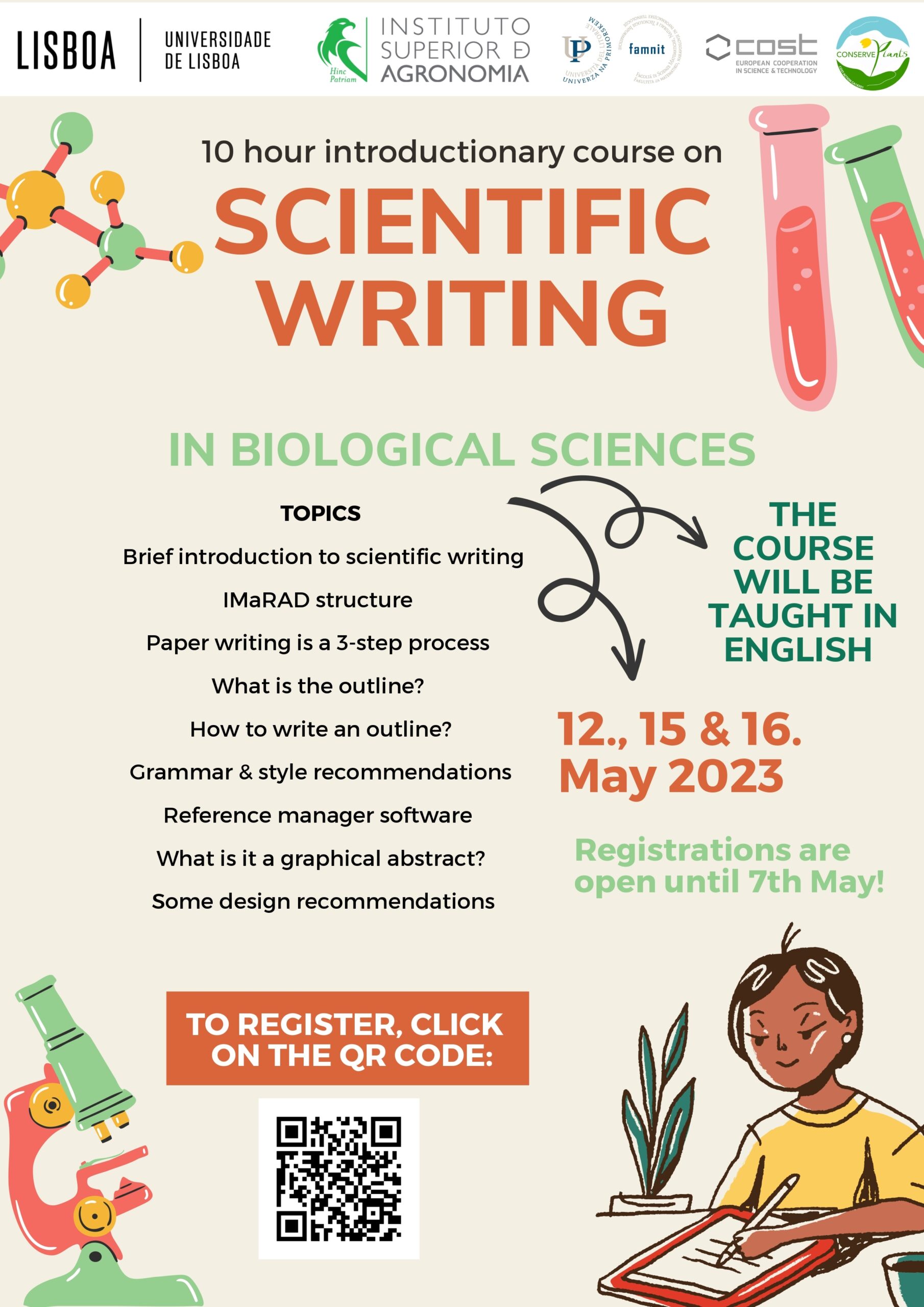 10-urni uvodni tečaj o znanstvenem pisanju iz bioloških ved, bo potekal 12. 15. in 16. maja 2023. Tečaj se izvaja v angleškem jeziku.
