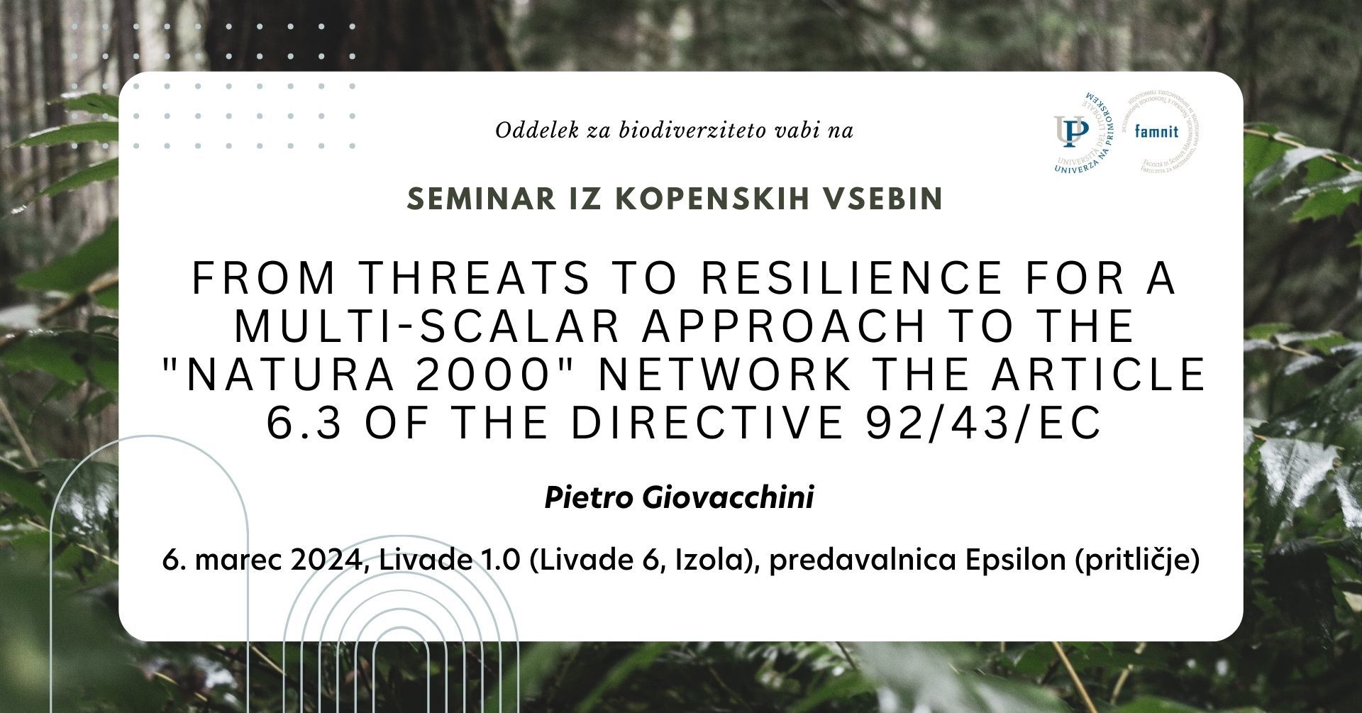Seminar iz kopenskih vsebin, z naslovom “From threats to resilience for a multi-scalar approach to the “Natura 2000” Network the article 6.3 of the Directive 92/43/EC“ bo izvedel Pietro Giovacchini v sredo, 6. marca 2024, v Livadah 1.0 (Livade 6, Izola), predavalnica Epsilon (pritličje), od 12. do 13. ure.