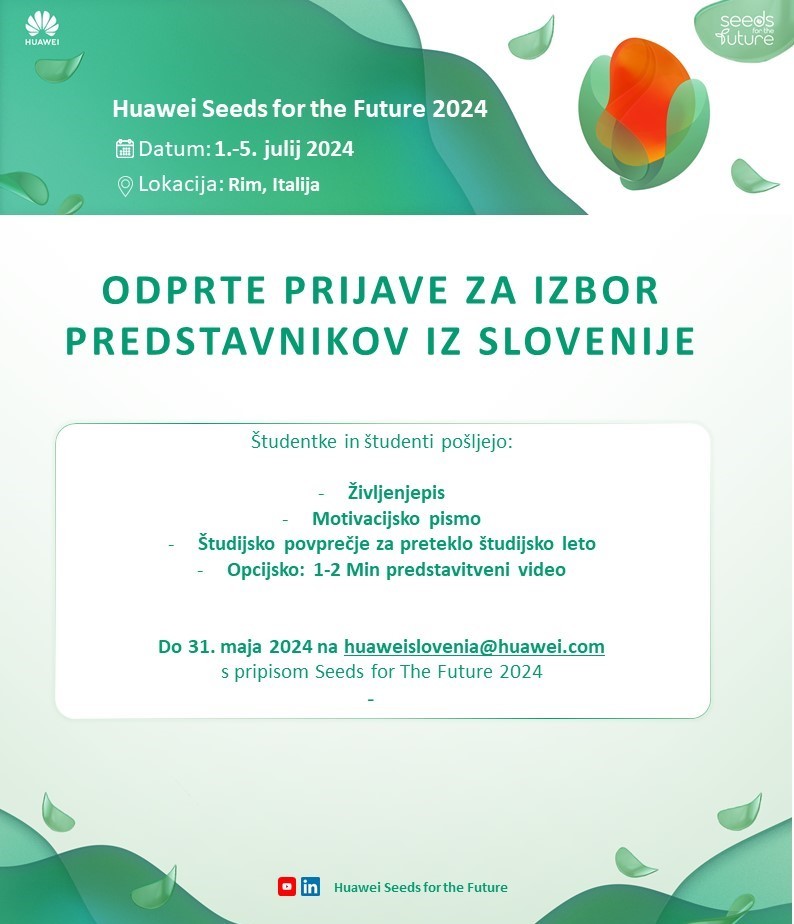 Prijave s pripisom Seeds for the Future 2024 sprejemamo do vključno 31. 5. 2024 na elektronskem naslovu huaweislovenia@huawei.com
