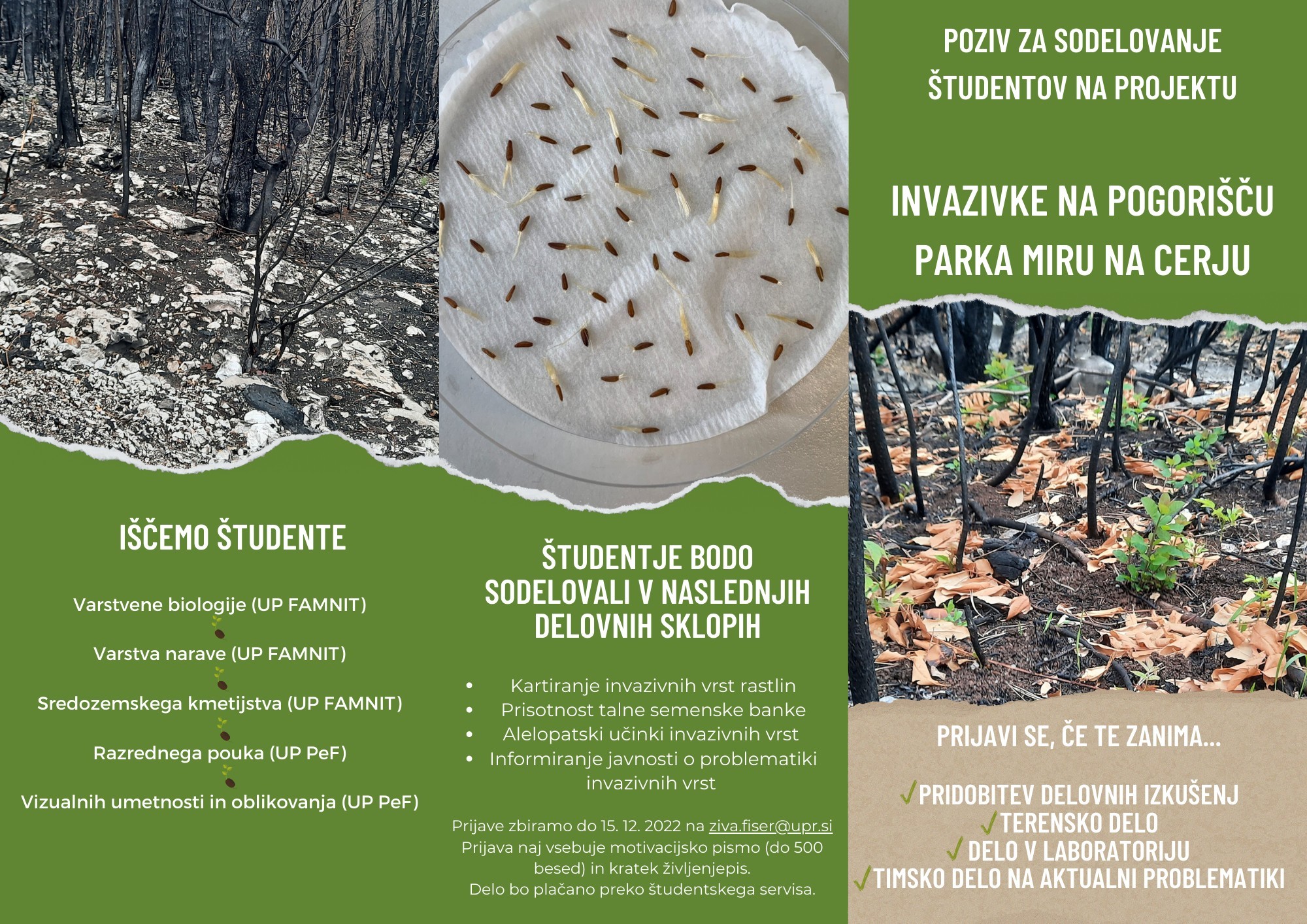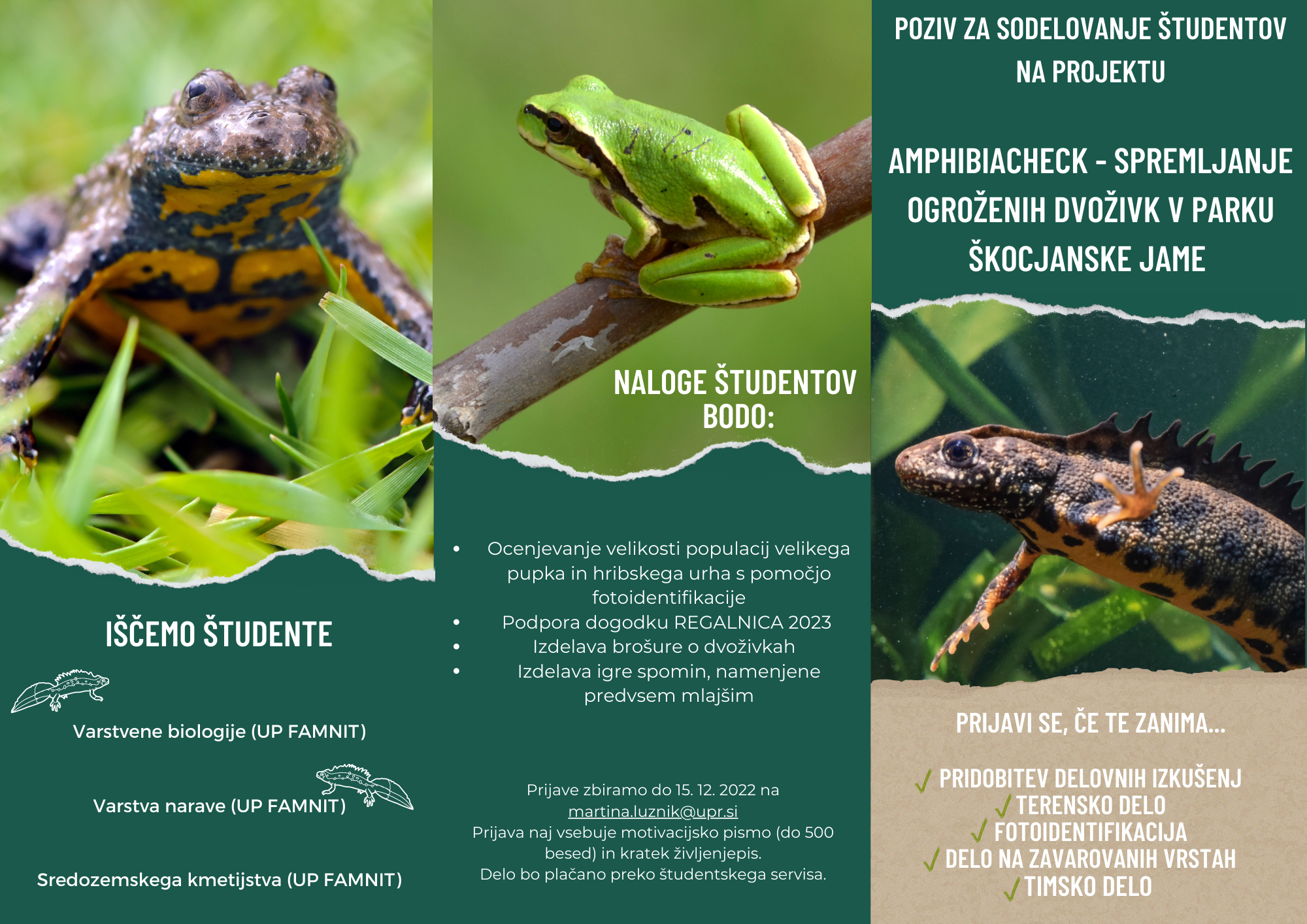 Odprte so prijave za delo na projektu “Invazivke na pogorišču Parka miru na Cerju” in projektu “Amphibiacheck – spremljanje ogroženih dvoživk v parku Škocjanske jame”, ki smo ju pridobili na razpisu Projektno delo za pridobitev praktičnih izkušenj in znanj študentov v delovnem okolju 2022/2023!