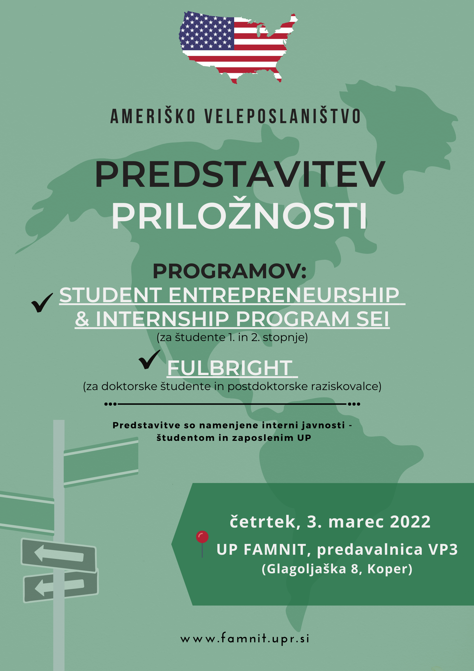Več podrobnosti o programu bo v četrtek, 3. marca 2022, ob 10.00 na UP FAMNIT (predavalnica Famnit VP3, drugo nadstropje, Glagoljaška 8, Koper), predstavila Charlotte Taft z Veleposlaništva ZDA. Predstavitve se bodo udeležili tudi SEI Alumni, ki bodo na voljo za vsa dodatna vprašanja.