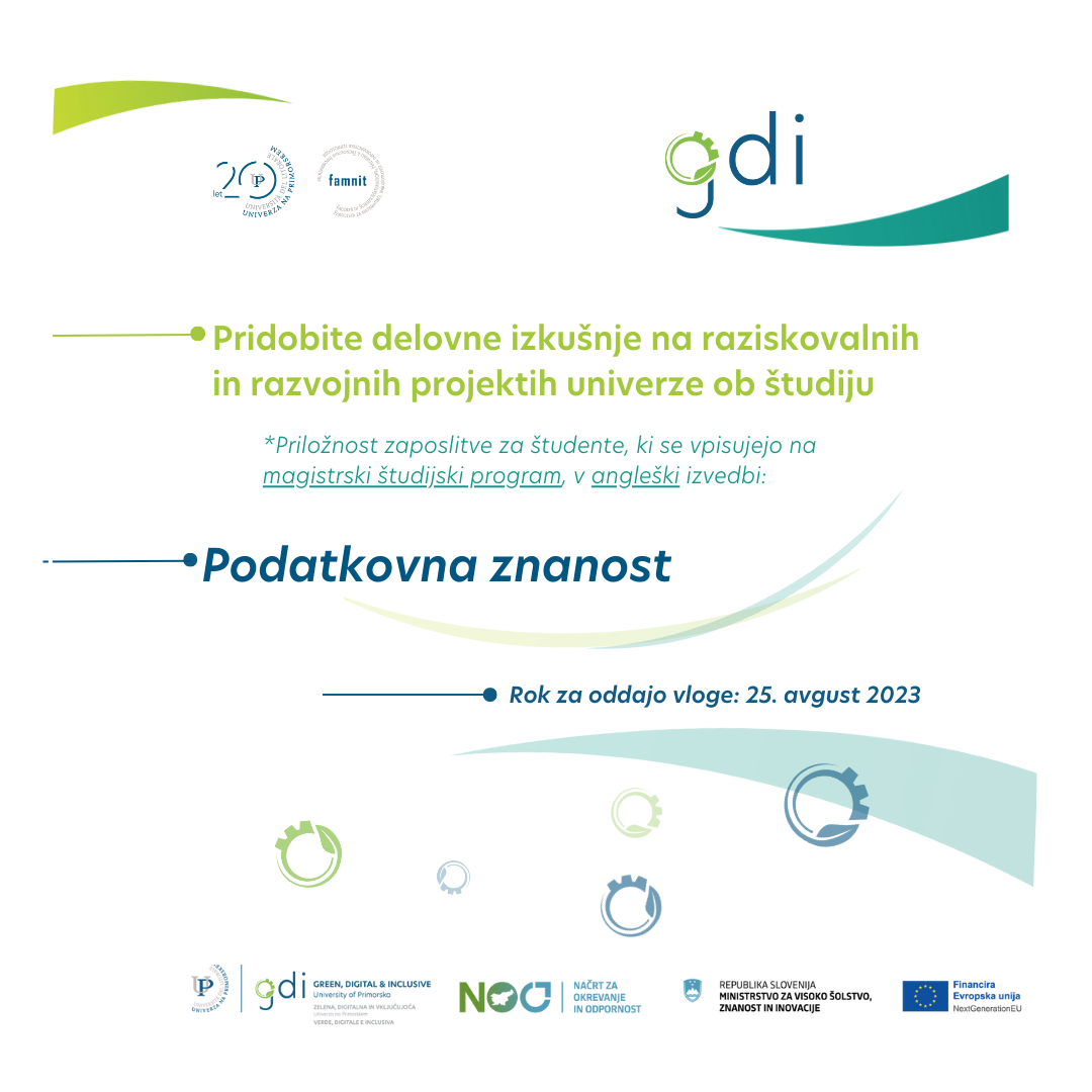 Univerza na Primorskem v študijskem letu 2023/2024 razpisuje inovativno izvedbo magistrskega študijskega programa Podatkovna znanost v angleškem jeziku UP Fakultete za matematiko, naravoslovje in informacijske tehnologije (UP FAMNIT) v okviru projekta »Zelena Univerza na Primorskem«, ki je eden izmed treh pilotnih projektov investicijskega projekta »Zelena, digitalna in vključujoča Univerza na Primorskem (GDI UP)«. Projekt sofinancirata Republika Slovenija, Ministrstvo za izobraževanje, znanost in šport, in Evropska unija – NextGenerationEU. Projekt se izvaja skladno z načrtom v okviru razvojnega področja Pametna, trajnostna in vključujoča rast, komponente Krepitev kompetenc, zlasti digitalnih in tistih, ki jih zahtevajo novi poklici in zeleni prehod (C3 K5), za ukrep investicija F. Izvajanje pilotnih projektov, katerih rezultati bodo podlaga za pripravo izhodišč za reformo visokega šolstva za zelen in odporen prehod v Družbo 5.0: projekt Pilotni projekti za prenovo visokega šolstva za zelen in odporen prehod.
