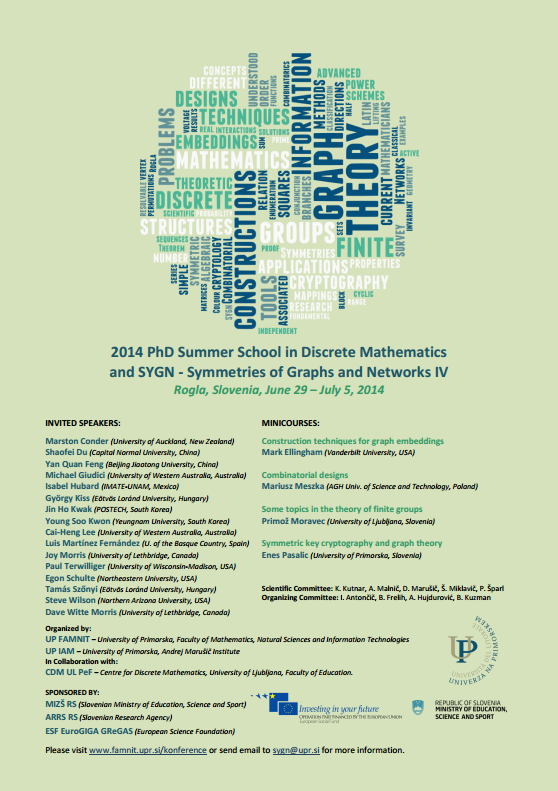 V nedeljo, 29. 6. 2014, se na Rogli pričenjata Mednarodna doktorska poletna šola iz diskretne matematike (2014 PhD Summer School in Discrete Mathematics) in mednarodna konferenca Symmetries of Graphs and Networks, obe v sklopu Aktivnosti 3 projekta UP IN SVET – Mednarodna vpetost Univerze na Primorskem.