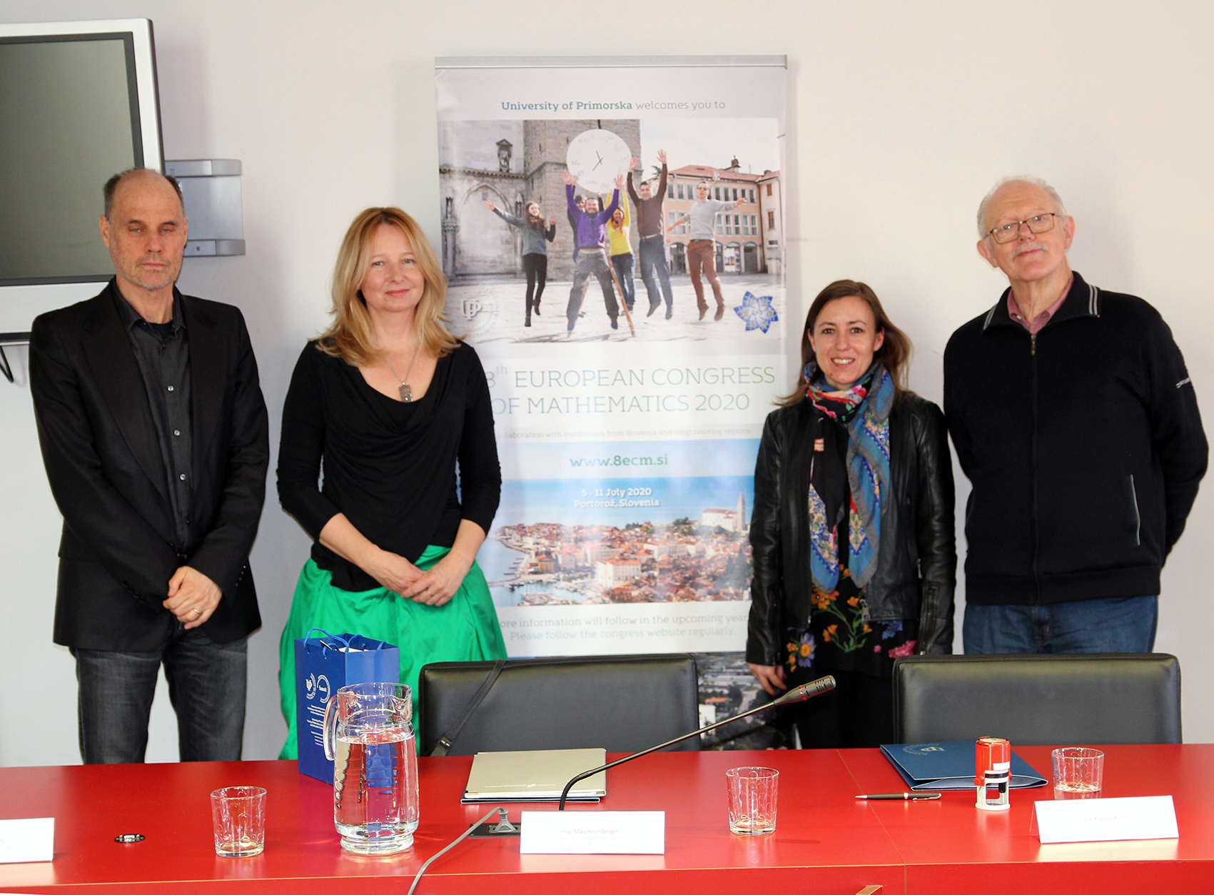 (Foto: prof. dr. Dragan Marušič, rektor UP, mag. Maja Krumberger, direktorica Slovenskega zavarovalnega združenja, prof. dr. Klavdija Kutnar, dekanja UP FAMNIT, prof. dr. Tomaž Pisanski, predsednik organizacijskega odbora 8ECM)