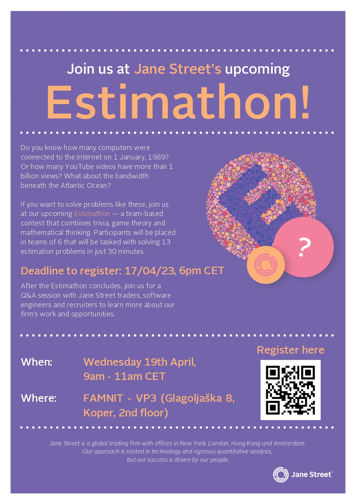 Estimathon bo potekal 19. aprila v Veliki predavalnici 3 UP FAMNIT (Glagoljaška 8, Koper) v drugem nadstropju.