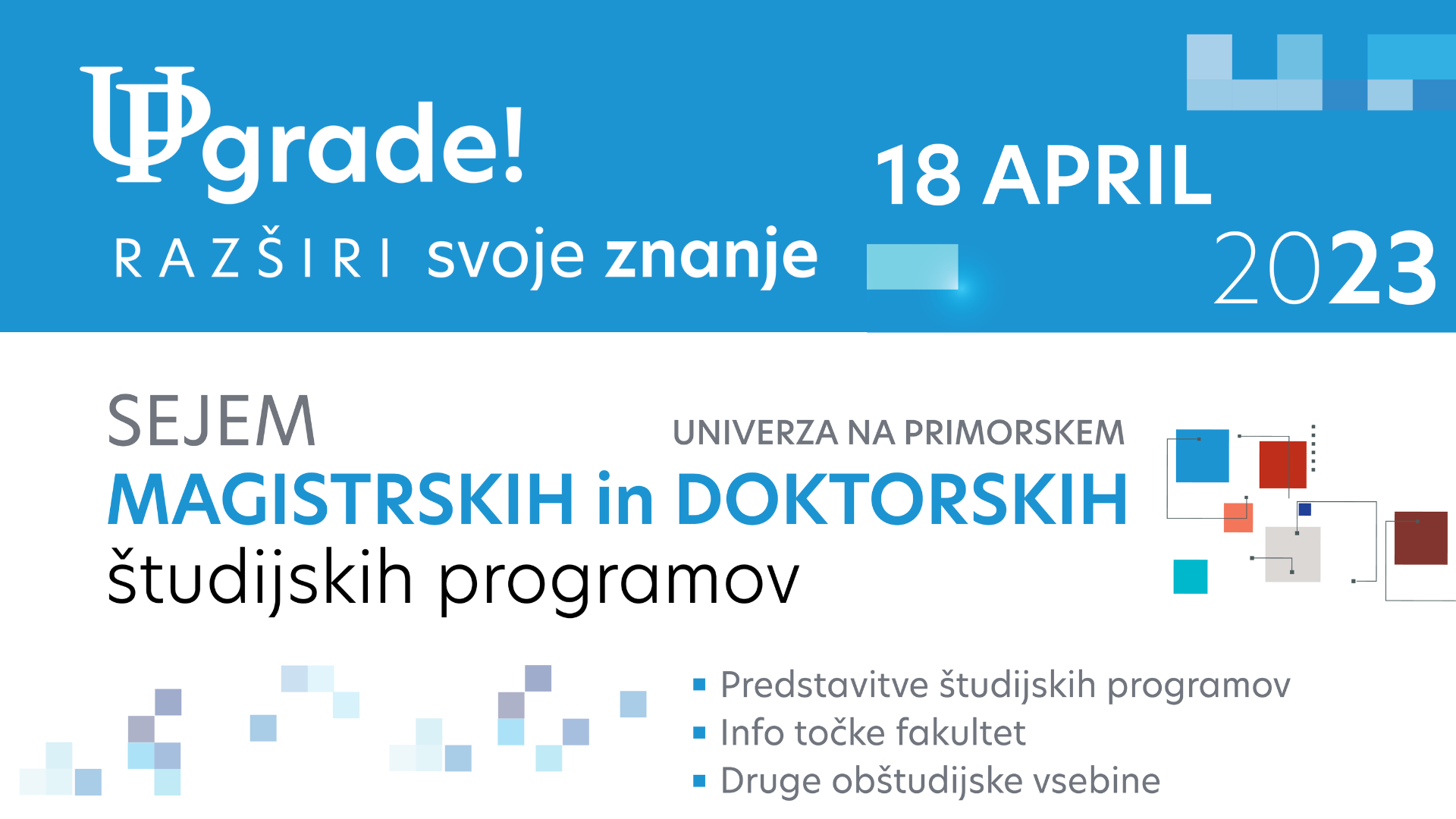 Dne 18. aprila 2023, med 9.00 in 18.00, v Kopru (na dvorišču UP Fakultete za humanistične študije) boste imeli priložnost pridobiti vse informacije na enem mestu, saj Univerza na Primorskem organizira UPgrade – sejem magistrskih in doktorskih študijskih programov UP, kjer bodo predstavljene: