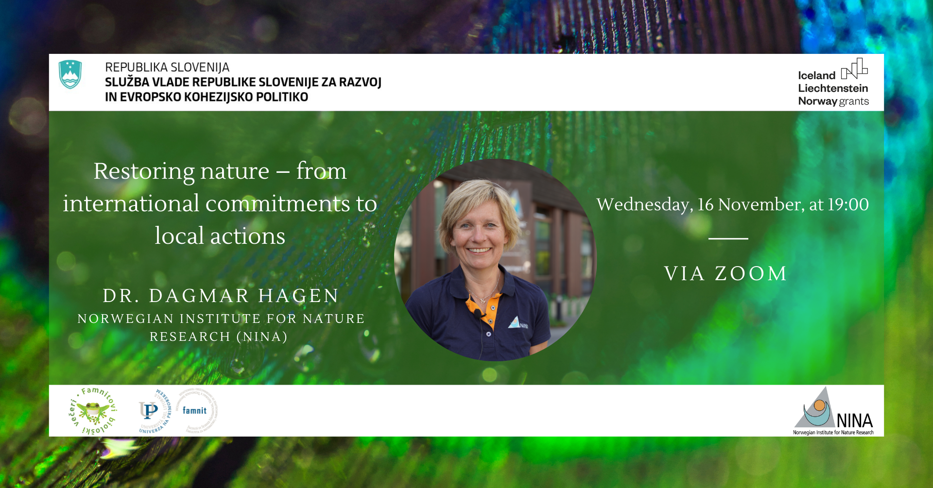 Predavanje se bo pričelo s predstavitvijo širšega pogleda na potrebo po obnovi ekosistemov in na to, kako je prenova teh v zadnjih letih vstopila v mednarodno, politično, znanstveno in gospodarsko okolje. Predavateljica bo opisala in prikazala povezavo globalnih ciljev z lokalnim načrtovanjem in iskanju pravih rešitev v lokalnem okolju. Na primerih dobrih praks že izvedenih projektov bo izpostavila obnove in blaženja posledic, aplicirane v različnih tipih narave. Pri tem bo predstavila tudi pomen obnove ekosistema k zmanjšanju izgube naravnega okolja in obnovi degradiranih zemljišč. V sklopu predavanja nas bo seznanila s tem kako vključevati deležnike, sodelovati z lokalnimi izvajalci in integracijo znanstvenega in “tihega” znanja, ki prinaša merljive rezultate za ekologijo, družbo in gospodarstvo.