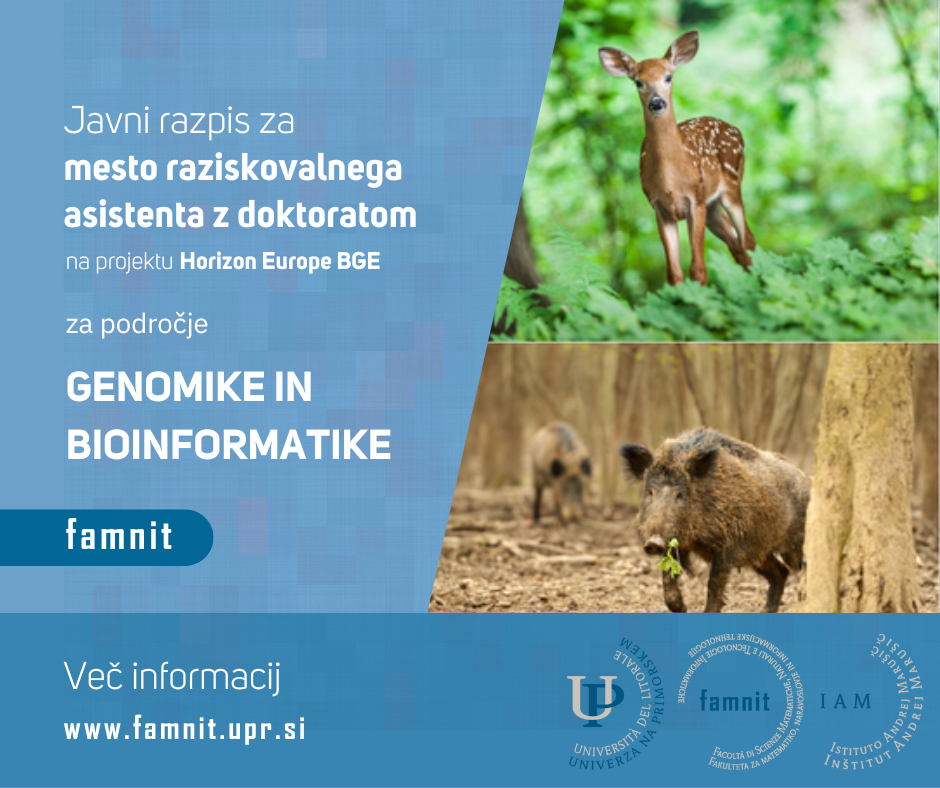 Univerza na Primorskem odpira mesto raziskovalnega asistenta z doktoratom na področju genomike in bioinformatike, in sicer na področju sekvenciranja celotnega genoma. Delovno mesto je za polni delovni čas (40 ur na teden) za dve leti z možnostjo podaljšanja. Izbrani kandidat bo večinoma vključen v projekt Obzorje Evropa “Biodiversity Genomic Europe” ki ga financira EU, in v nacionalni raziskovalni projekt na področju genomike prostoživečih živali.