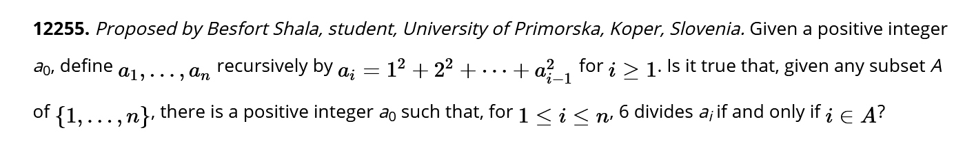 AMM je zelo prestižna mednarodna matematična revija, v kateri je eno poglavje namenjeno reševanju problemov v olimpijskem stilu. »Temu poglavju redno sledim,« pravi Besfort Shala, »in zato sem se odločil predlagati nekaj svojih problemov, od katerih je bil en tudi sprejet in objavljen. Doseči objavo v tej reviji ni enostavno, saj morajo problemi vsebovati elemente elegance in težavnosti. Ker gre za specifičen problem, priprava ni trajala dolgo, zamisel za pripravo pa se je pojavila spontano, ko sem poskušal rešiti neke druge probleme. Nisem prepričan, da bo to kakorkoli vplivalo na moje prihodnje raziskovalno delo, zagotovo pa je dosežek dobra motivacija za nadaljevanje dosedanjega dela. Kolikor vem, je to prva objava UP FAMNIT v tej reviji, kar pomeni, da je to tudi za fakulteto še dodatna promocija