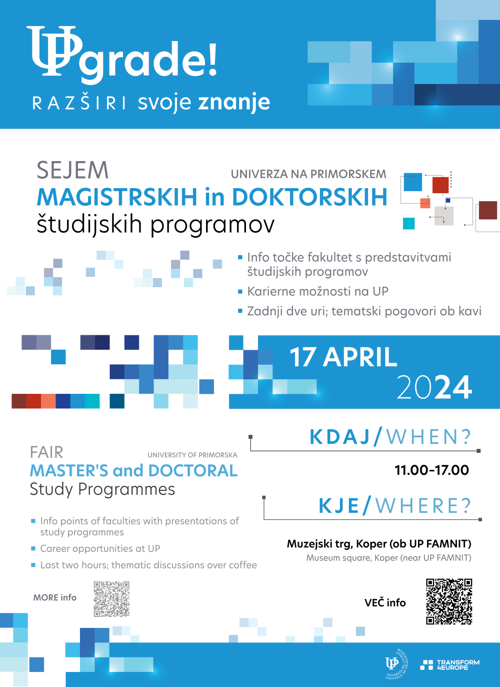 Univerza na Primorskem pripravlja že drugi sejem magistrskih in doktorskih študijskih programov “UPgrade! – razširi svoje znanje”, ki bo potekal v sredo, 17 aprila med 11. in 17. uro na Muzejskem trgu ob UP FAMNIT.