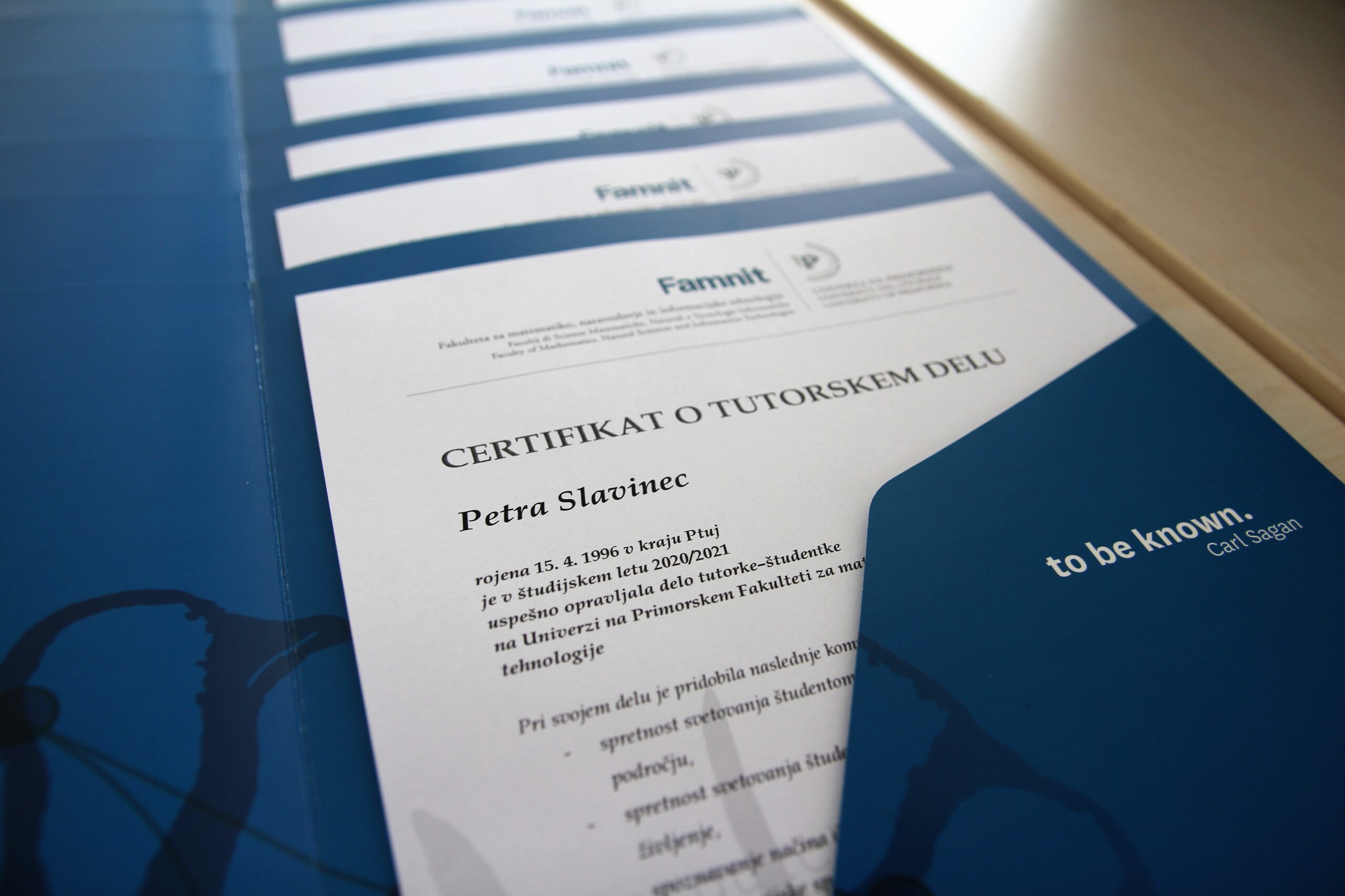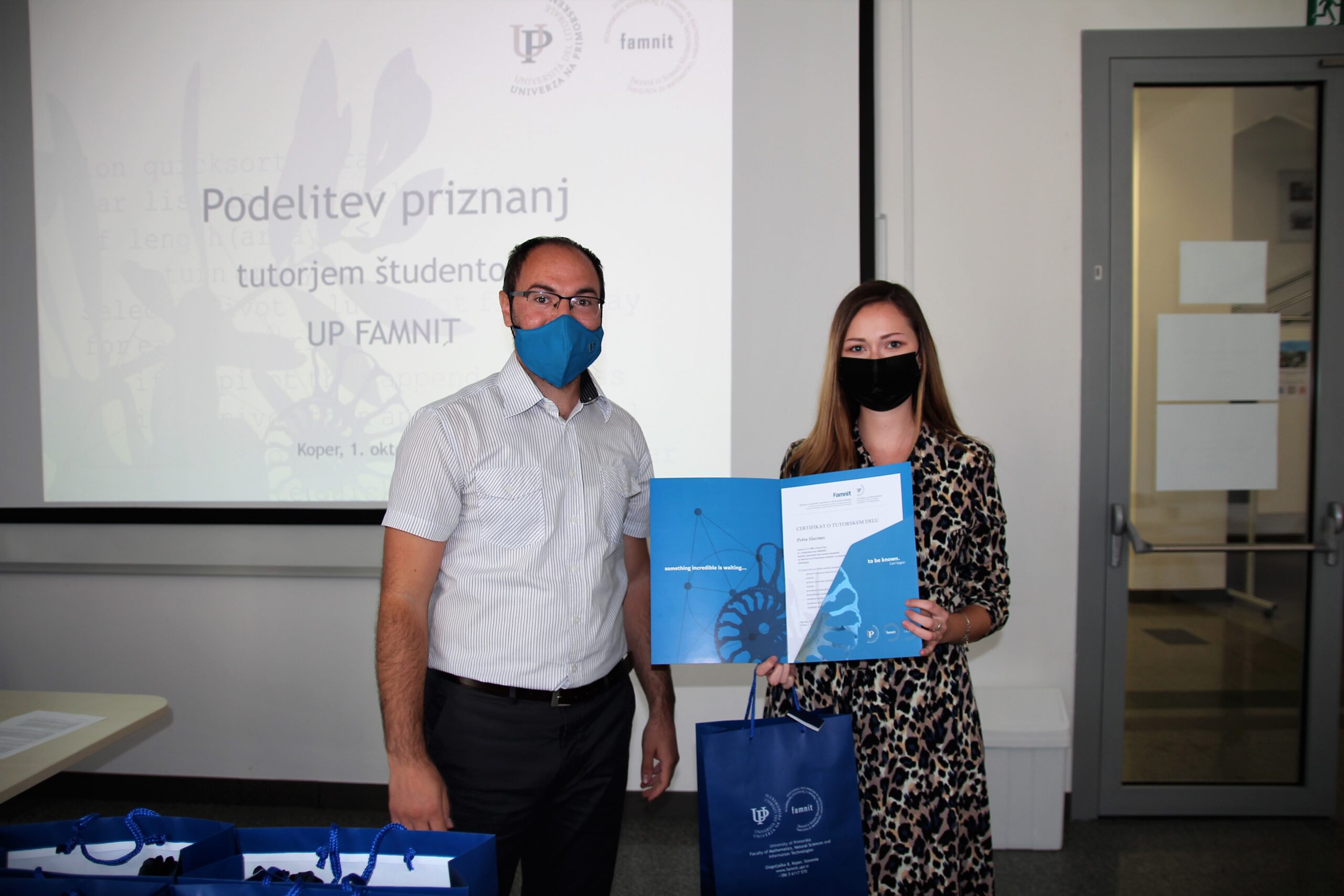 Ob 12.00 je sledila podelitev priznanj tutorjem, ki so v preteklem študijskem letu študentom pomagali pri reševanju morebitnih težav ter uvajanju v študentsko življenje. Pol ure kasneje pa je sledilo fotografiranje brucev UP FAMNIT na Titovem trgu.