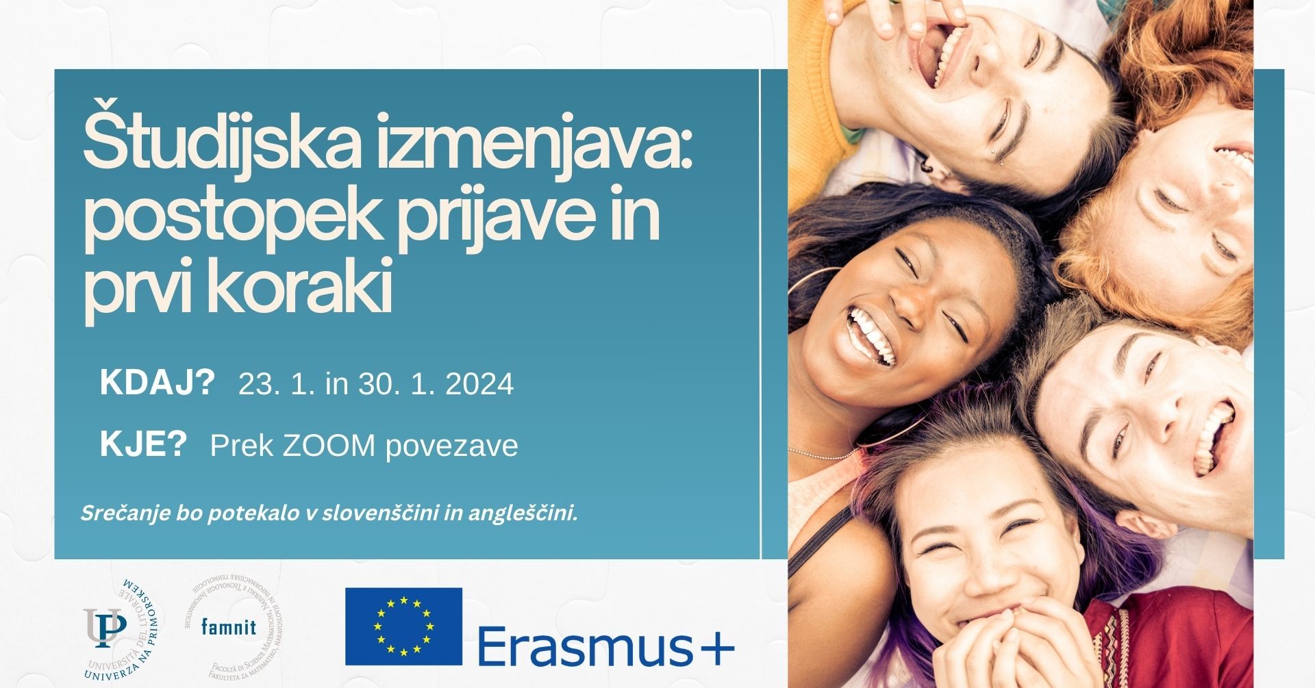 V zvezi z novim razpisom za študijske izmenjave Erasmus + v študijskem letu 2024/2025 vabimo vse, ki bi se želeli prijaviti na izmenjavo, da se nam pridružite na predstavitvi postopka prijave in prvih korakov na poti do uspešne realizacije vaše izmenjave.