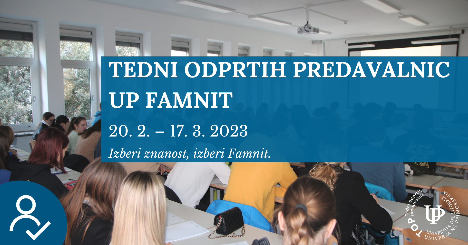 UP FAMNIT in ostale članice Univerze na Primorskem od 20. februarja do 17. marca 2023 odpiramo svoja vrata za dijake in ostalo zainteresirano javnost. Pridružili se nam boste lahko na predavanjih, delavnicah ter pri ostalih vsebinah, ki smo jih pripravili.