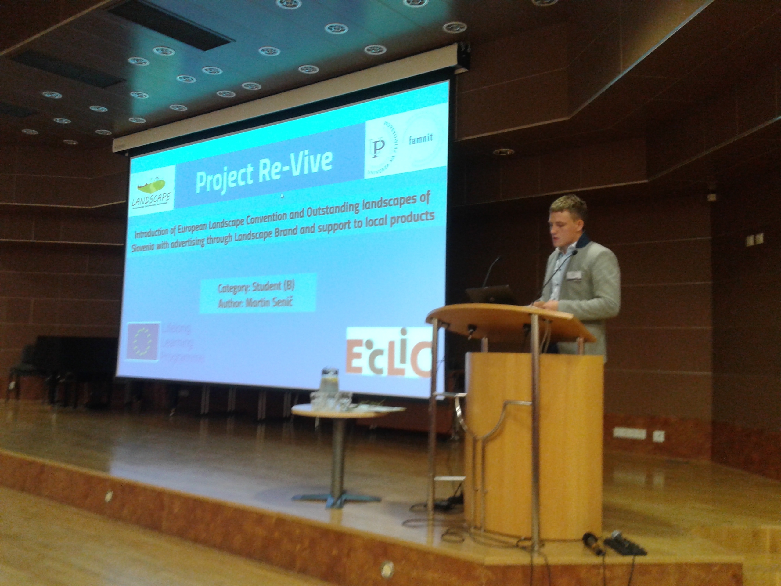 Namen projekta Re-Vive je informiranje o izjemnih slovenskih krajinah in približanje Evropske konvencije o krajini (nadalje EKK) večjemu številu posameznikov oz. širši javnosti. Izredno pomembno je kako EKK interpretirati ciljni publiki, da bo le-ta zanjo privlačna, s še zmeraj jasnim sporočilom. Martin je predlagal primer sinteze produkta značilnega za določeno izjemno krajino ter koncepta inovativnega oblikovanja embalaže oziroma etikete s pomočjo IKT orodij, katere prispevek je informiranje o slovenskih krajinah in EKK prek potrošništva. Predlagal je ustanovitev skupne znamke z imenom »KRAJINA«, ki bi nudila podporo lokalnim produktom in skrbela za njihovo večjo prepoznavnost. Oblika podane embalaže bo dajala prostor čim več zanimivim informacijam o sami krajini, produktu ali drugih zanimivostih. Podal je tudi predlog izdelave spletne strani in multimedijskih posnetkov posameznih krajin, ter dostop do nalaganja opisov, slik in posnetkov krajin naključnim uporabnikom.
