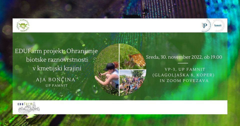 Naslednji dogodek bo v sredo, 30. novembra 2022, ob 19.00 prek aplikacije ZOOM in v živoAja Bončina (UP FAMNIT) bo izvedla predavanje z naslovom EDUFarm projekt: Ohranjanje biotske raznovrstnosti v kmetijski krajini: vloga pridelovalcev in finančnih mehanizmov”.