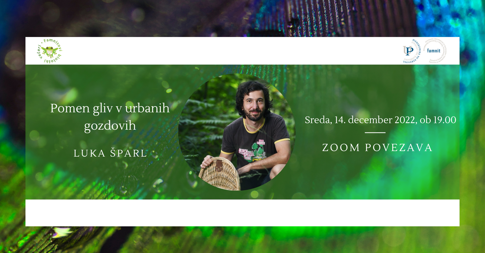 Naslednji dogodek bo v sredo, 14. decembra 2022, ob 19.00 prek aplikacije ZOOM. Luka Šparl bo izvedel predavanje z naslovom “Pomen gliv v urbanih gozdovih”.
