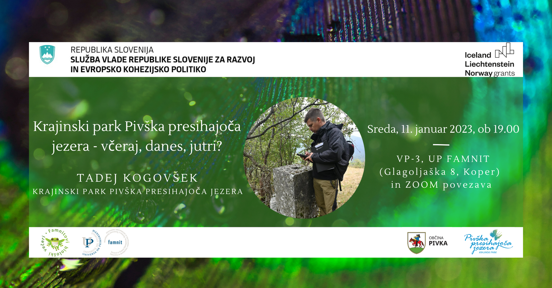 Naslednji dogodek bo v sredo, 11. januarja 2023, ob 19.00, v Veliki predavalnici 3, UP FAMNIT in preko aplikacije ZOOMTadej Kogovšek bo izvedel predavanje z naslovom Krajinski park Pivška presihajoča jezera – včeraj, danes, jutri?”