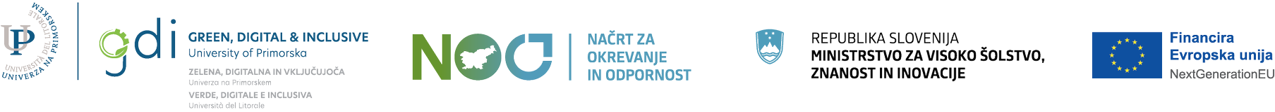 Projekt Zelena, digitalna in vključujoča Univerza na Primorskem (GDI UP) sofinancirata Republika Slovenija, Ministrstvo za visoko šolstvo, znanost in inovacije in Evropska unija – NextGenerationEU. Projekt se izvaja skladno z načrtom v okviru razvojnega področja Pametna, trajnostna in vključujoča rast, komponente Krepitev kompetenc, zlasti digitalnih in tistih, ki jih zahtevajo novi poklici in zeleni prehod (C3 K5), za ukrep investicija F. Izvajanje pilotnih projektov, katerih rezultati bodo podlaga za pripravo izhodišč za reformo visokega šolstva za zelen in odporen prehod v Družbo 5.0: projekt Pilotni projekti za prenovo visokega šolstva za zelen in odporen prehod.