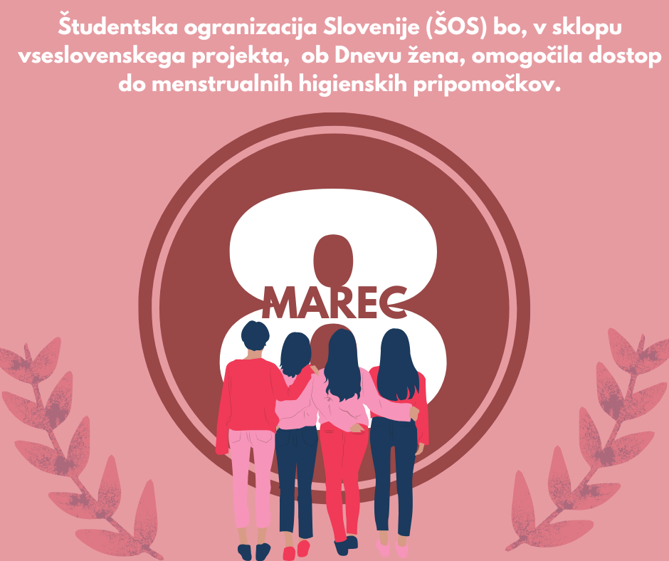 Študentska organizacija Slovenije (ŠOS), bo ob Dnevu žena, 8. marca 2023, na vseh slovenskih univerzah v Mariboru, Ljubljani in na Primorskem omogočila dostop do menstrualnih higienskih pripomočkov.