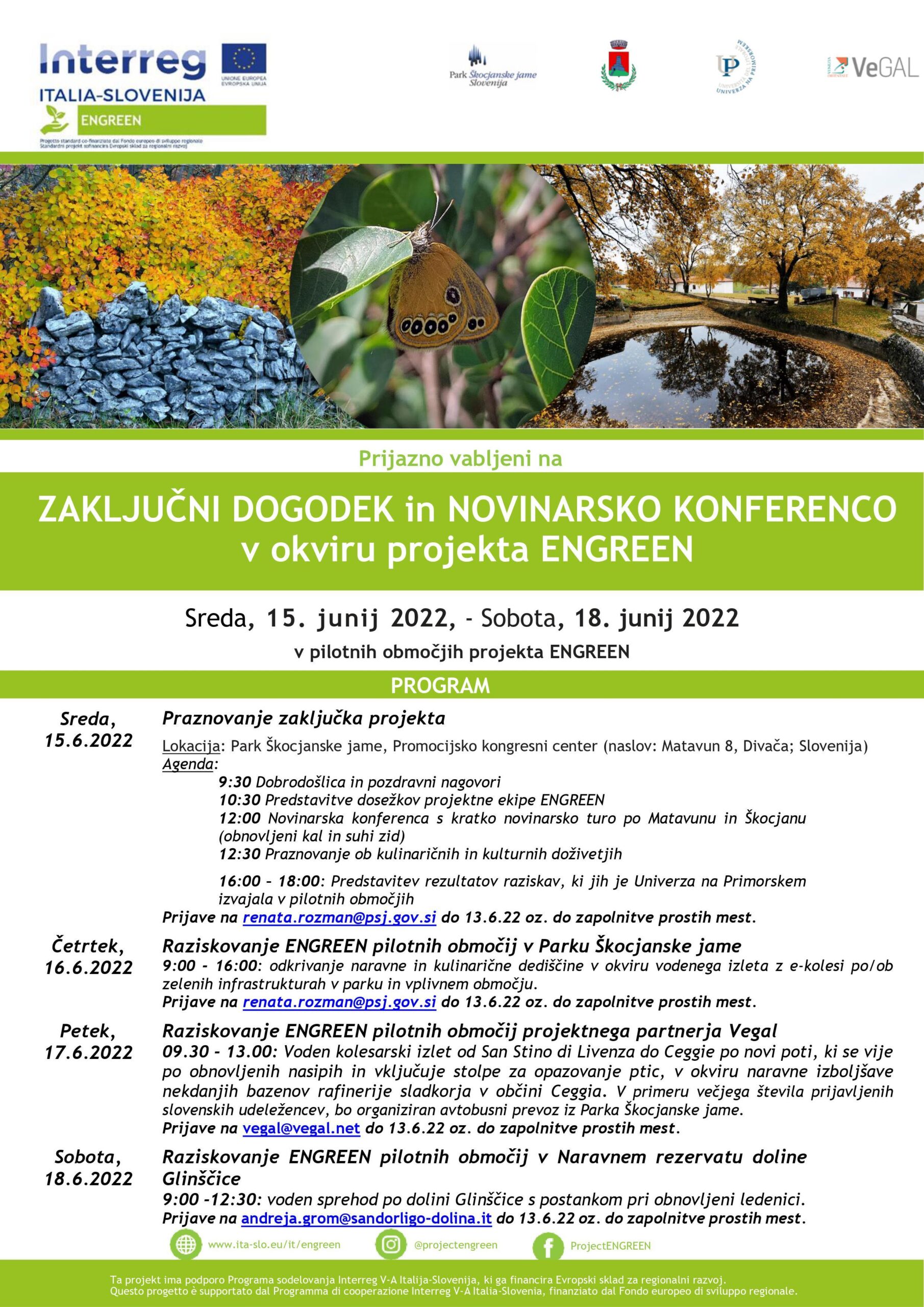 Projekt ENGREEN – Krepitev zelene infrastrukture v čezmejni kulturni krajini IT-SI se konec avgusta izteka, zato partnerji na projektu prirejajo večdnevni zaključni dogodek, ki bo potekal od 15. 6. do 18. 6. 2022.