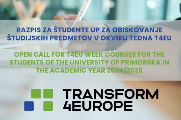 RAZPIS ZA ŠTUDENTE UP ZA OBISKOVANJE ŠTUDIJSKIH PREDMETOV V OKVIRU TEDNA T4EU//OPEN CALL FOR T4EU WEEK COURSES FOR THE STUDENTS OF THE UNIVERSITY OF PRIMORSKA IN THE ACADEMIC YEAR 2024/20259 marca, 2024
