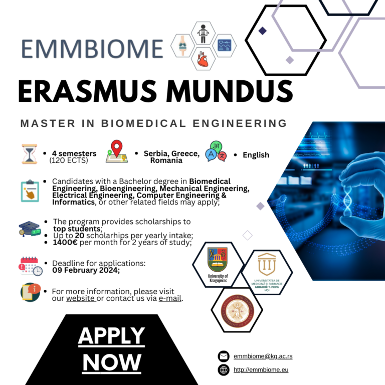 Skupni magistrski program Erasmus Mundus s področja biomedicinskega inženiringa na Univerzi v Kragujevcu // Erasmus Mundus Joint Master Program in Biomedical Engineering at the University of Kragujevac19 januarja, 2024