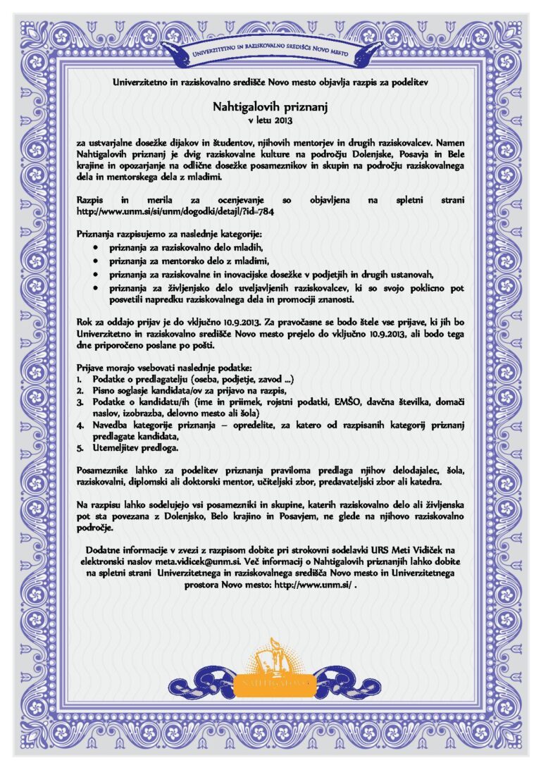 Objavljen je razpis za podelitev Nahtigalovih priznanj za leto 2013