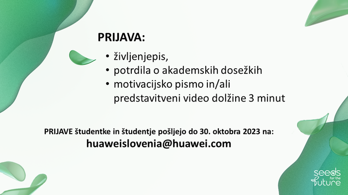 Huawei bo med 6. in 13. novembrom 2023 v Sloveniji že četrto leto zapored organiziral program za mlade talente Seeds for the Future. Glavni cilj je izboljšati digitalne veščine mladih, jih vključiti v sodobno digitalno okolje ter jih navdihniti za IKT področje. K prijavi v brezplačni spletni program vabljeni študenti in študentke iz slovenskih fakultet. Prijave se zaključijo 30. oktobra.