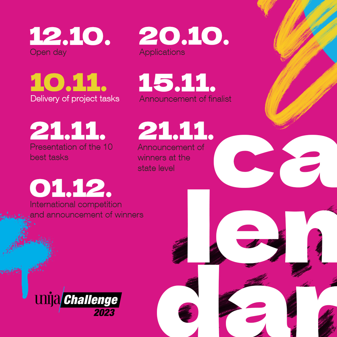 - Rok za prijavo je 20. oktober. Na študentsko tekmovanje se lahko prijavite tukaj: Študentsko regijsko tekmovanje – Unija Challenge Prijavite se lahko individualno ali kot tim. Če se odločite za tim, morate določiti nosilca projektne naloge.