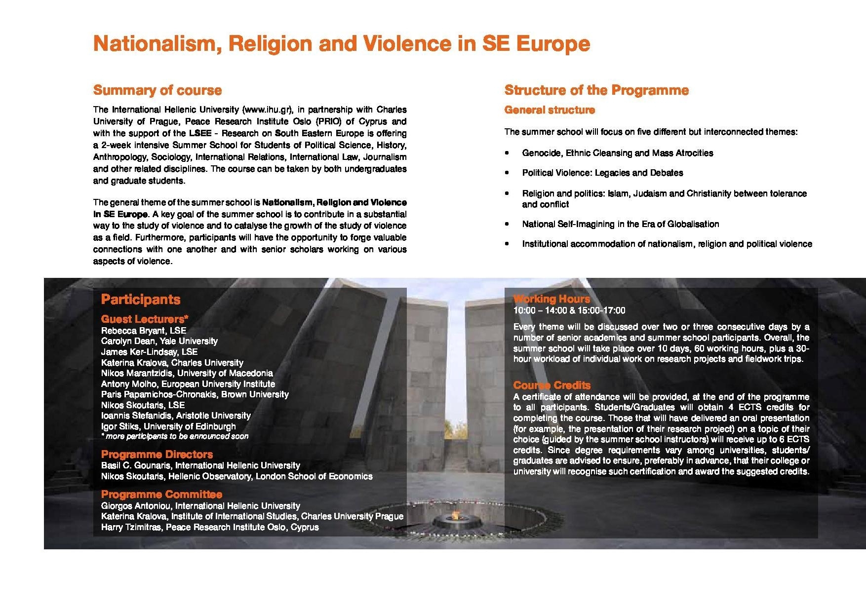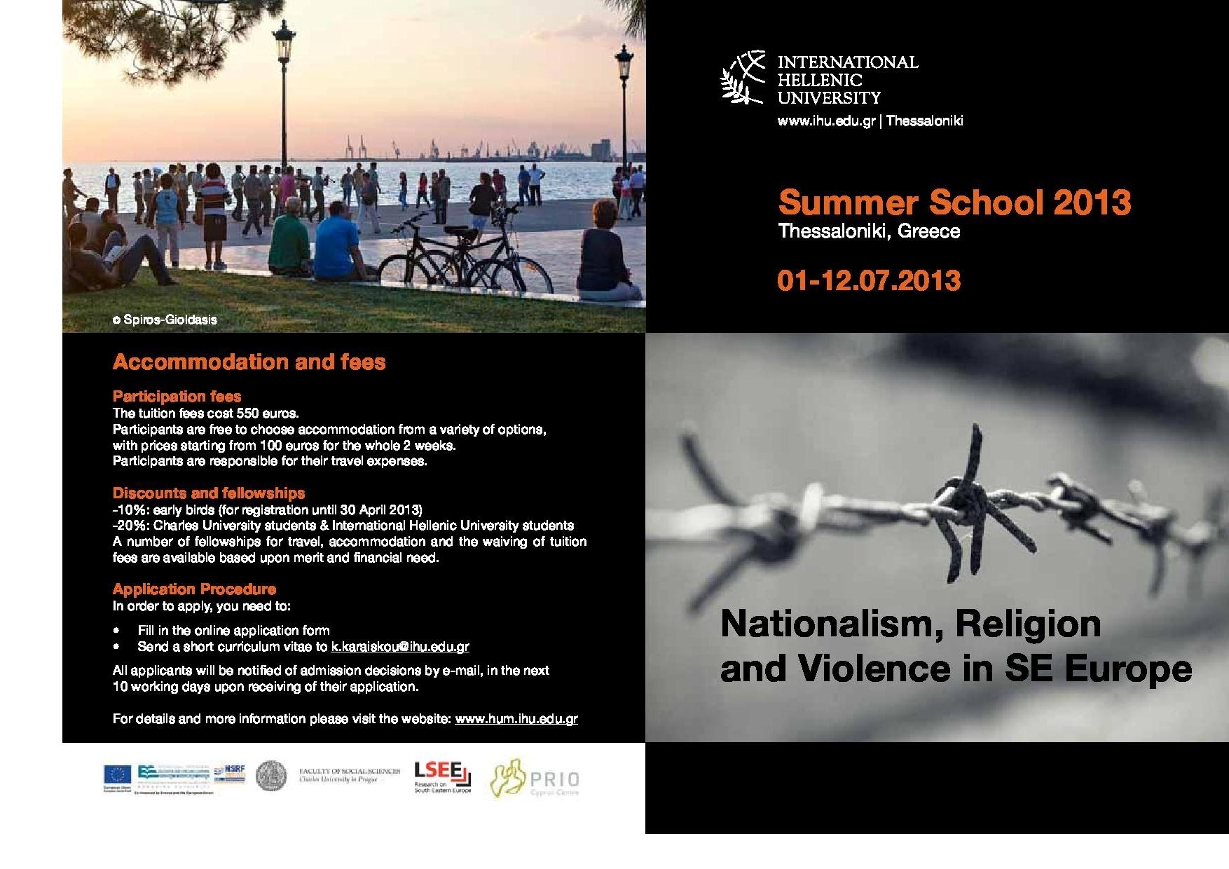 Julija 2013 univerzi International Hellenic University, Thessaloniki in Charles University, Prague soorganizirata poletno šolo z naslovom: “Nationalism, Religion and Violence in SE Europe”